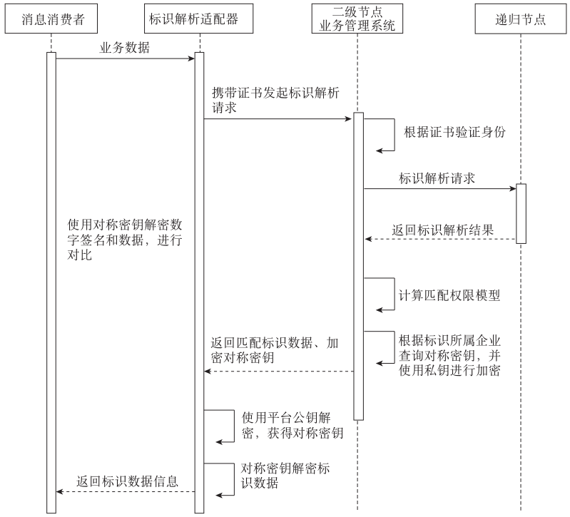 圖4給出了標識解析及解密流程。信息消費者的身份校驗通過后,標識解析請求將被轉發至遞歸節點。在拿到遞歸節點返回的信息后,二級節點業務管理系統會按照元數據模板及權限策略對解析的結果進行數據格式處理,并查詢標識所屬的企業節點的對稱密鑰。首先,二級節點業務管理系統會使用平臺私鑰對查詢到的對稱密鑰進行加密,以確保密鑰在傳輸過程中得到保護。然后,將加密后的對稱密鑰與經數據格式處理后的解析結果一起返回給標識解析適配器。接下來,標識解析適配器接收平臺返回的信息,使用平臺的公鑰對加密的對稱密鑰進行解密,從而獲得真正的對稱密鑰。利用該對稱密鑰,標識解析適配器可以對經數據格式處理的結果進行解密,最終獲得標識解析的結果。通過這一流程,標識解析適配器能夠安全地獲取并使用對稱密鑰,從而保障敏感數據在傳輸和處理過程中的安全性。標識解析結果能夠被正確地還原并返回給信息消費者,實現了對標識的解析和數據的獲取。