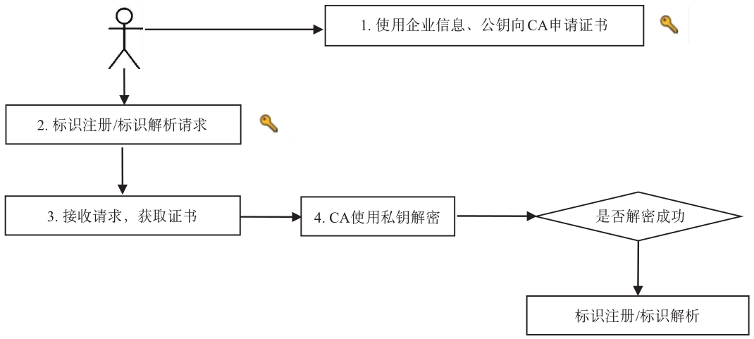 若解密成功,說明證書是由CA平臺的私鑰加密而獲得的,證明信息消費者的身份合法可信,即完成了對請求者的身份鑒別。在此情況下,二級節點可以繼續處理標識解析請求,提供相應的標識信息。反之,若解密不成功,意味著該請求者的身份存在異常情況。二級節點會將解密失敗識別為異常情況,并采取相應的安全措施,包括拒絕處理請求、記錄異常事件并通知相關安全團隊等,以保障整個標識解析體系的安全。通過這樣的身份驗證流程,標識解析體系能夠確保信息消費者的身份是合法且可信的,避免了未經授權的用戶或節點獲取敏感標識數據,從而保護了企業的數據和系統安全。