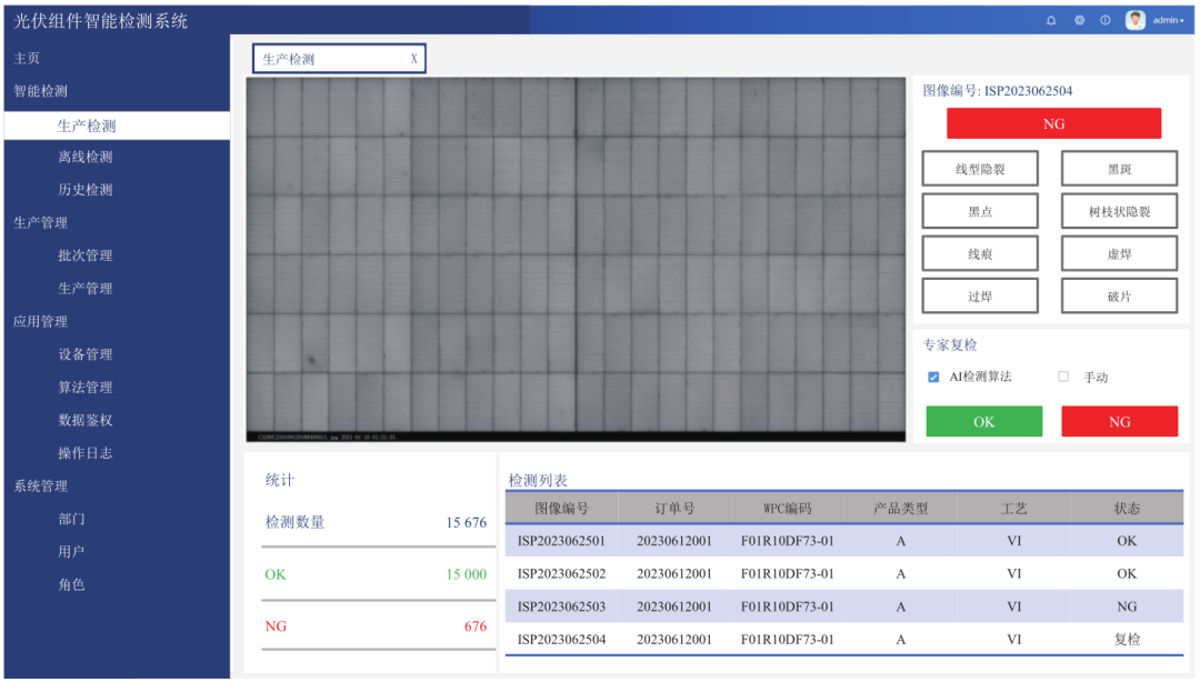在產(chǎn)線側(cè)部署了一套基于云邊端架構(gòu)的AI質(zhì)檢系統(tǒng)(質(zhì)檢平臺(tái)架構(gòu)如圖5所示,光伏質(zhì)檢系統(tǒng)界面如圖6所示),從EL質(zhì)檢儀獲取圖像數(shù)據(jù),面對(duì)主要的19種缺陷進(jìn)行自動(dòng)檢測(cè)。對(duì)工業(yè)產(chǎn)線初始過(guò)檢率、漏檢率高的問(wèn)題,本項(xiàng)目采集兩萬(wàn)張樣本進(jìn)行模型訓(xùn)練,迭代70余輪后,檢測(cè)精度由部署前的漏檢率10%提升至部署后的漏檢率<0.2%、過(guò)檢率<4%。同時(shí),系統(tǒng)將重點(diǎn)質(zhì)檢數(shù)據(jù)上報(bào)邊緣側(cè)部署的工業(yè)質(zhì)檢業(yè)務(wù)平臺(tái),實(shí)現(xiàn)質(zhì)量數(shù)據(jù)全流程智能化管理。除此以外,在機(jī)器代替人工的數(shù)字化轉(zhuǎn)型浪潮中,中國(guó)移動(dòng)上海產(chǎn)業(yè)研究院還為客戶(hù)提供了數(shù)字化管理全套解決方案,助力企業(yè)完成管理模式的變革。