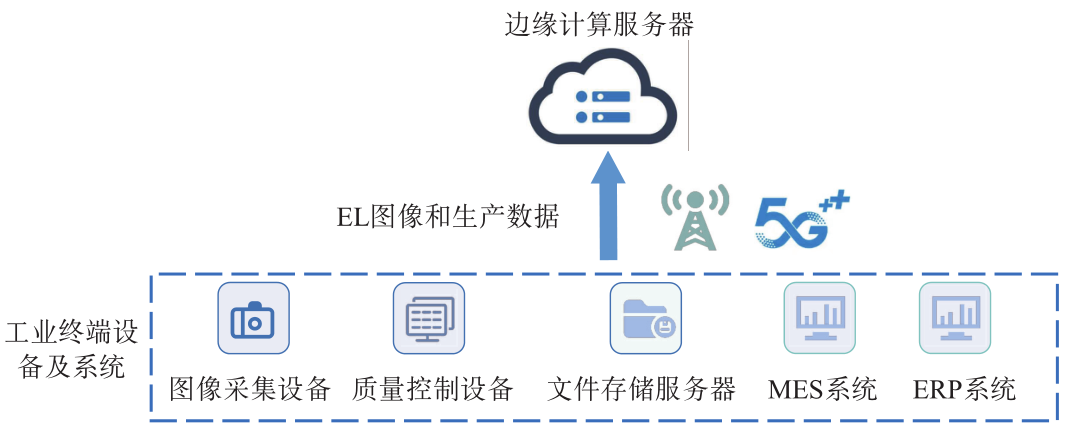 3.2.1 EL圖像數(shù)據(jù)采集基于5G智能網(wǎng)關(guān)的EL圖像數(shù)據(jù)采集與傳輸方法,通過(guò)5G智能網(wǎng)關(guān)采集生產(chǎn)現(xiàn)場(chǎng)的數(shù)據(jù),借助5G專(zhuān)網(wǎng)大帶寬、廣連接、低時(shí)延的特點(diǎn)[9],將分散在生產(chǎn)現(xiàn)場(chǎng)的眾多設(shè)備、系統(tǒng)中的數(shù)據(jù)上傳到邊緣計(jì)算服務(wù)器。借助5G專(zhuān)網(wǎng),EL圖像可以實(shí)時(shí)傳輸,使EL設(shè)備安裝、布局時(shí)不再拘泥于現(xiàn)場(chǎng)網(wǎng)線布置限制,可以隨時(shí)隨地將圖像實(shí)時(shí)傳輸?shù)絆nePower-AI質(zhì)檢平臺(tái);同時(shí),5G網(wǎng)絡(luò)的大帶寬特性確保EL圖像可以高質(zhì)量傳輸:快速傳輸4~8 K的EL圖像,100%保留EL圖像的細(xì)節(jié)和清晰度,提高了光伏檢測(cè)算法的識(shí)別準(zhǔn)確率[10]。EL圖像數(shù)據(jù)采集及傳輸過(guò)程如圖2所示。