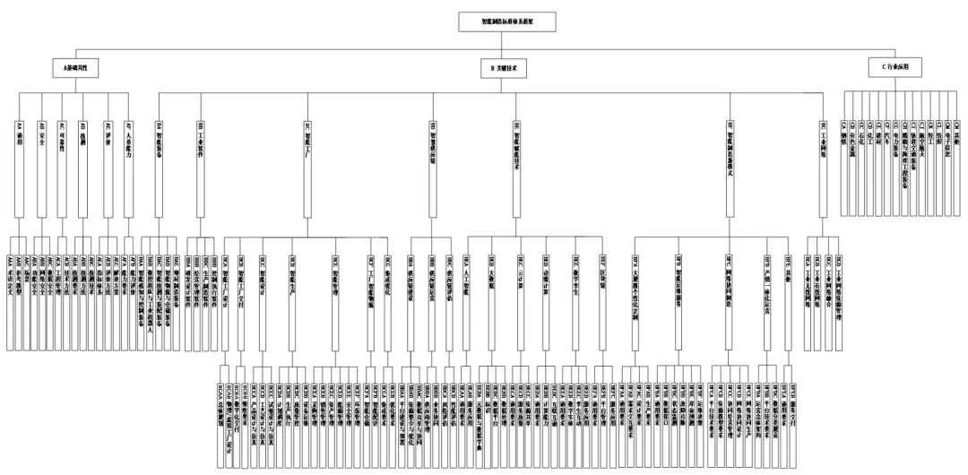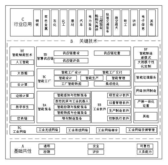 具體而言,A基礎(chǔ)共性標(biāo)準(zhǔn)包括通用、安全、可靠性、檢測(cè)、評(píng)價(jià)、人員能力等6大類(lèi),位于智能制造標(biāo)準(zhǔn)體系結(jié)構(gòu)圖的最底層,主要用于統(tǒng)一智能制造相關(guān)概念,解決智能制造基礎(chǔ)共性關(guān)鍵問(wèn)題,是B關(guān)鍵技術(shù)標(biāo)準(zhǔn)和C行業(yè)應(yīng)用標(biāo)準(zhǔn)的支撐。B關(guān)鍵技術(shù)標(biāo)準(zhǔn)是智能制造系統(tǒng)架構(gòu)智能特征維度在生命周期維度和系統(tǒng)層級(jí)維度所組成的制造平面的投影,主要解決企業(yè)智能制造推進(jìn)過(guò)程中需要解決的關(guān)鍵技術(shù)問(wèn)題,其中BA智能裝備標(biāo)準(zhǔn)主要聚焦智能特征維度的資源要素,BB工業(yè)軟件標(biāo)準(zhǔn)主要聚焦智能特征維度的系統(tǒng)集成,BC智能工廠標(biāo)準(zhǔn)主要聚焦智能特征維度的資源要素和系統(tǒng)集成,BD智慧供應(yīng)鏈標(biāo)準(zhǔn)對(duì)應(yīng)智能特征維度互聯(lián)互通、融合共享和系統(tǒng)集成,BE智能賦能技術(shù)標(biāo)準(zhǔn)對(duì)應(yīng)智能特征維度的資源要素、互聯(lián)互通、融合共享、系統(tǒng)集成和新興業(yè)態(tài),BF智能制造新模式標(biāo)準(zhǔn)對(duì)應(yīng)智能特征維度的新興業(yè)態(tài),BG工業(yè)網(wǎng)絡(luò)標(biāo)準(zhǔn)對(duì)應(yīng)智能特征維度的互聯(lián)互通和融合共享。C行業(yè)應(yīng)用標(biāo)準(zhǔn)位于智能制造標(biāo)準(zhǔn)體系結(jié)構(gòu)圖的最頂層,面向行業(yè)具體需求,對(duì)A基礎(chǔ)共性標(biāo)準(zhǔn)和B關(guān)鍵技術(shù)標(biāo)準(zhǔn)進(jìn)行細(xì)化和落地,指導(dǎo)各行業(yè)推進(jìn)智能制造。