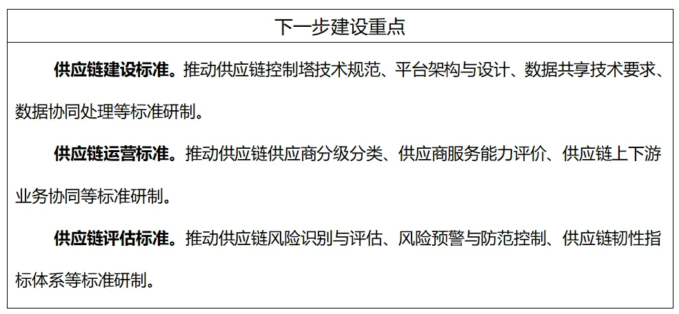 主要包括供應(yīng)鏈風(fēng)險(xiǎn)識(shí)別與評(píng)估、風(fēng)險(xiǎn)預(yù)警與防范控制等風(fēng)險(xiǎn)評(píng)估標(biāo)準(zhǔn);供應(yīng)鏈韌性指標(biāo)體系、測(cè)試與評(píng)估方法等性能評(píng)估標(biāo)準(zhǔn)。