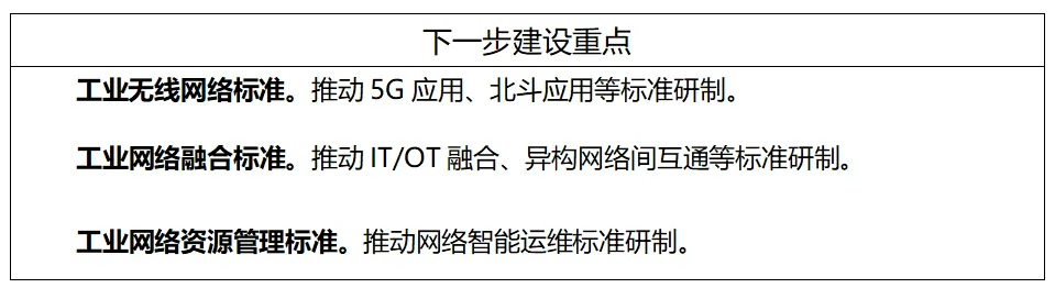 工業(yè)無(wú)線網(wǎng)絡(luò)標(biāo)準(zhǔn)主要包括無(wú)線局域網(wǎng)(WLAN)、無(wú)線可尋址遠(yuǎn)程傳感器高速通道(WirelessHART)、用于工廠自動(dòng)化/過(guò)程自動(dòng)化的工業(yè)無(wú)線網(wǎng)絡(luò)(WIA-FA/PA)、窄帶物聯(lián)網(wǎng)(NB-IoT)、5G應(yīng)用、北斗應(yīng)用等標(biāo)準(zhǔn)。工業(yè)有線網(wǎng)絡(luò)標(biāo)準(zhǔn)主要包括現(xiàn)場(chǎng)總線、工業(yè)以太網(wǎng)、工業(yè)無(wú)源光纖網(wǎng)絡(luò)(xPON)、工業(yè)綜合布線、單對(duì)線以太網(wǎng)等標(biāo)準(zhǔn)。工業(yè)網(wǎng)絡(luò)融合標(biāo)準(zhǔn)主要包括確定性網(wǎng)絡(luò)(DetNet)、時(shí)間敏感網(wǎng)絡(luò)(TSN)、信息技術(shù)/運(yùn)營(yíng)技術(shù)(IT/OT)融合、異構(gòu)網(wǎng)絡(luò)間互通、IPv6+、高可靠組網(wǎng)等標(biāo)準(zhǔn)。工業(yè)網(wǎng)絡(luò)資源管理標(biāo)準(zhǔn)主要包括網(wǎng)絡(luò)地址管理、網(wǎng)絡(luò)頻譜管理、網(wǎng)絡(luò)智能運(yùn)維等標(biāo)準(zhǔn)。