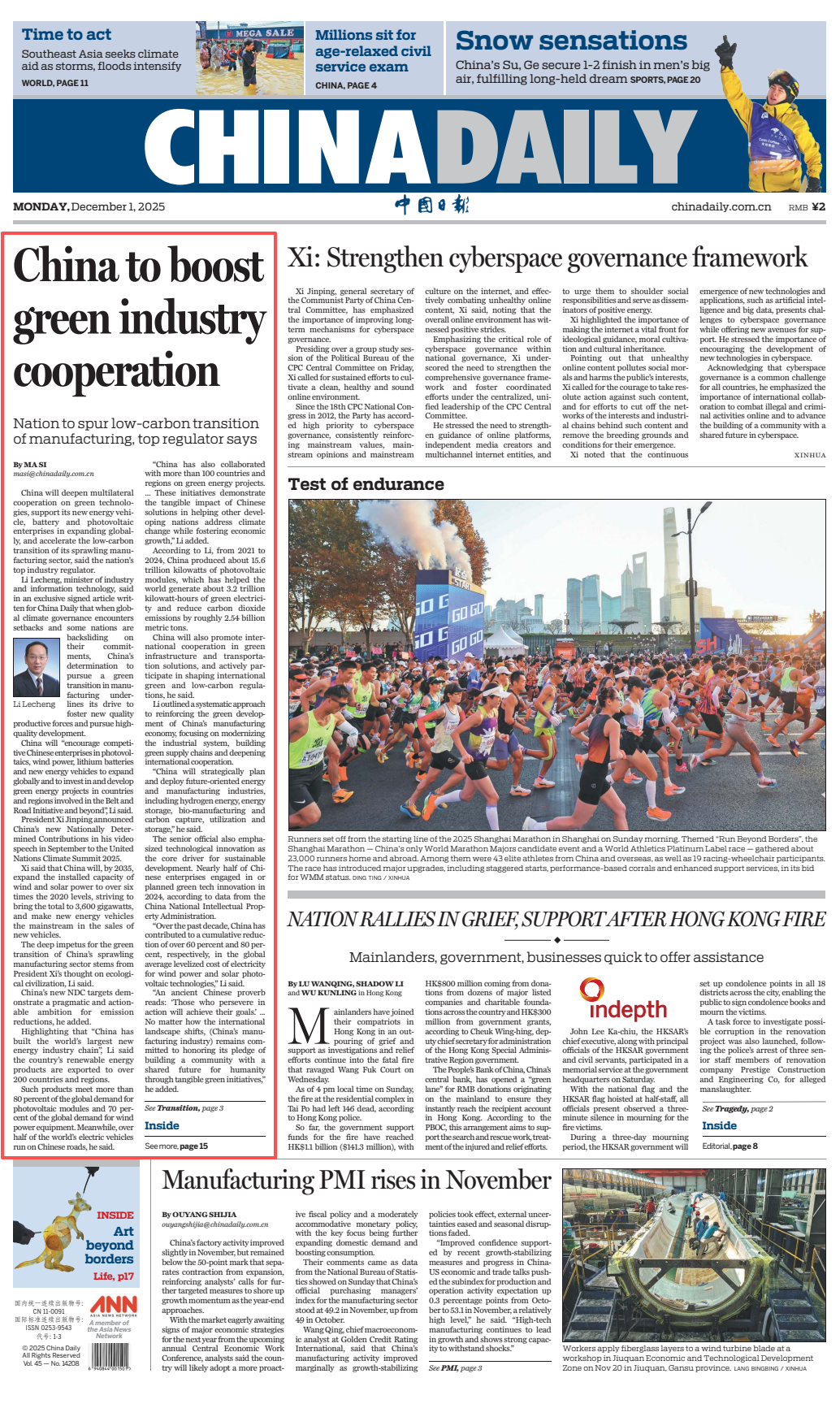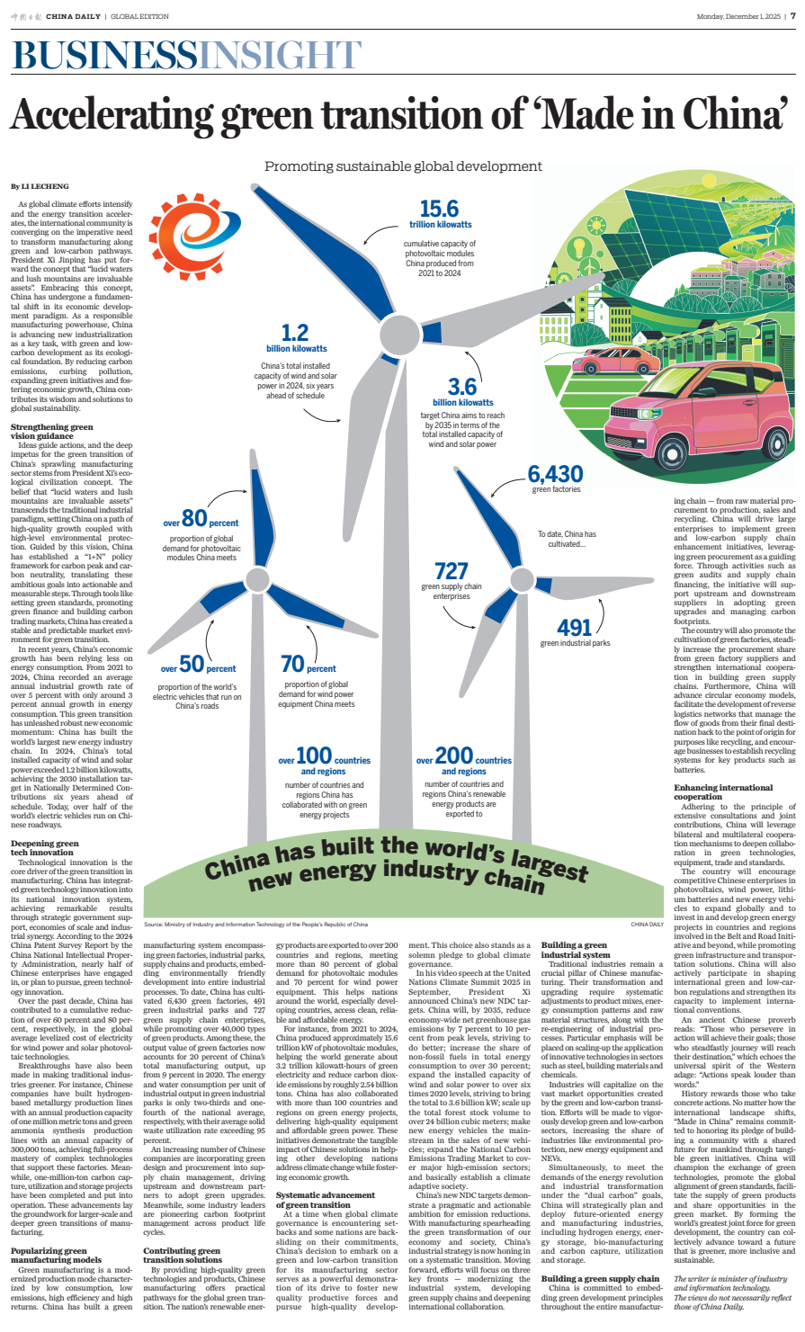 12月1日,《中國日報》刊發(fā)工業(yè)和信息化部黨組書記、部長李樂成英文署名文章,題為《加快中國制造綠色低碳轉(zhuǎn)型 促進(jìn)全球可持續(xù)發(fā)展》。全文如下: