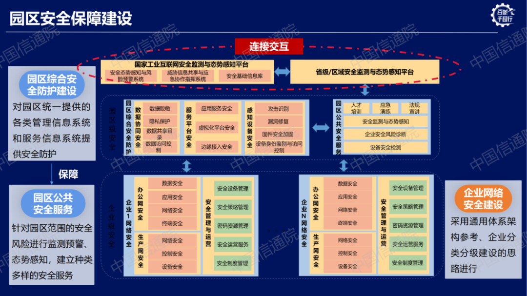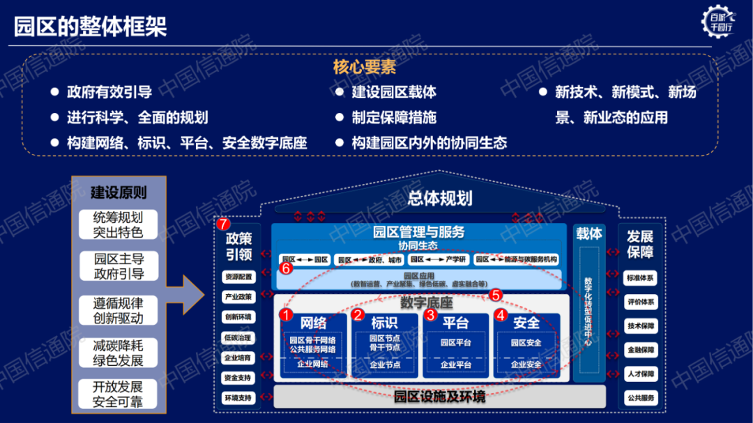工業互聯網園區整體框架:工業互聯網園區的建設與發展,應在國家和各級地方政府政策措施的引領下,以科學規劃為指導,通過打造網絡、標識、平臺、安全等園區數字底座,構建園區內部與外部的數據流動閉環,形成各產業角色之間的協同有機生態。建設數字化轉型促進中心等載體,以標準、評價、金融等體系為保障,通過新技術、新模式、新場景、新業態的應用,形成園區的健康、低碳、良性、區域一體化發展的新發展模式,建立園區發展特色和發展優勢。