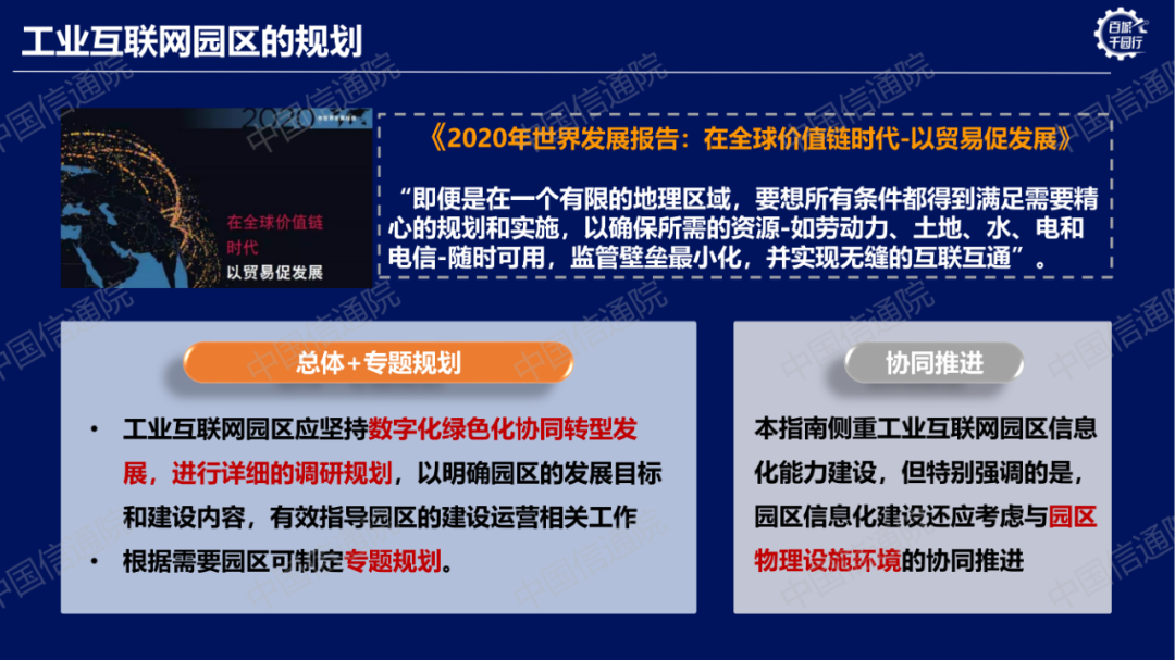 工業互聯網園區是以高質量發展為目標,按照工業互聯網內涵要求,規劃、建設、運營、提升的新型園區。園區應緊密圍繞我國建設現代化經濟體系這一戰略目標,以協同創新、集群集約、虛實融合、綠色低碳、安全生產為導向,通過網絡、標識、平臺、安全體系和新模式、新業態的構建,來指導新園區建設和存量園區轉型發展。