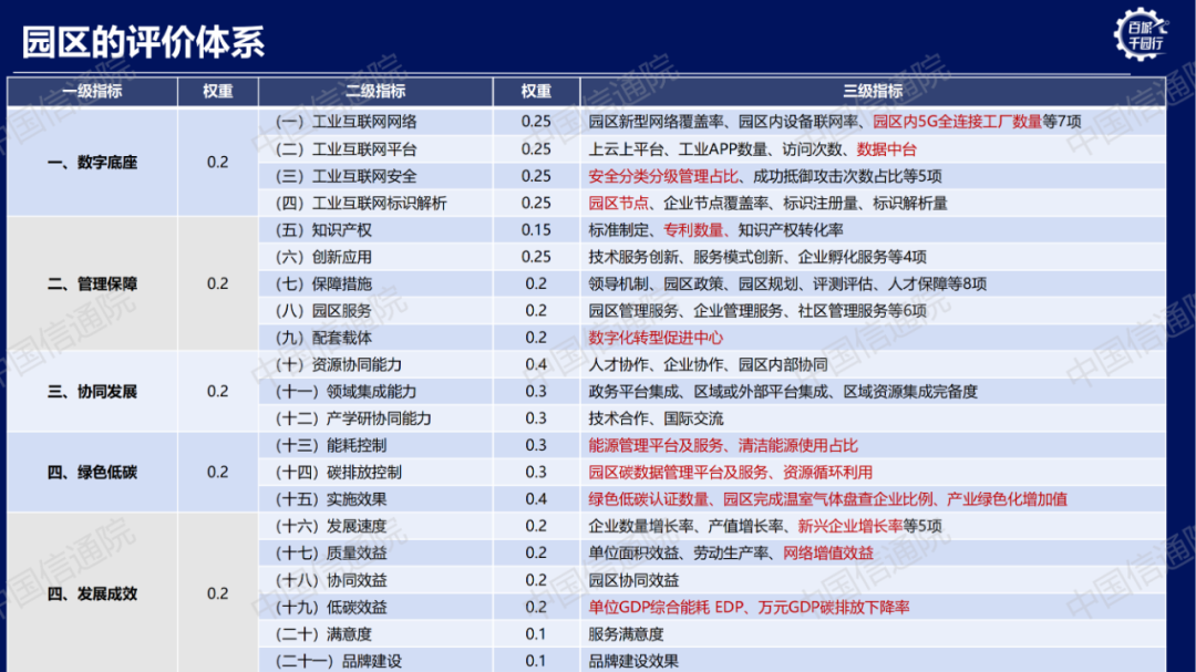工業互聯網園區評價指標體系通過科學的方法,分別從數字底座、管理與服務、協同發展、綠色低碳、發展成效5個要素作為評價的一級指標,并對各項一級指標進行細化,形成工業互聯網網絡、工業互聯網標識解析等21項二級指標,69項三級指標的綜合評估體系。
