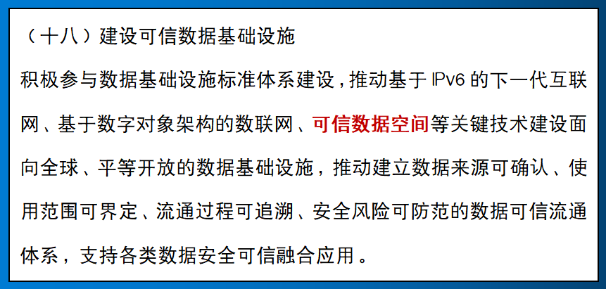 為貫徹落實(shí)黨中央、國(guó)務(wù)院關(guān)于構(gòu)建數(shù)據(jù)基礎(chǔ)制度更好發(fā)揮數(shù)據(jù)要素作用的決策部署,深入實(shí)施《北京市數(shù)字經(jīng)濟(jì)促進(jìn)條例》,北京市發(fā)布《關(guān)于更好發(fā)揮數(shù)據(jù)要素作用進(jìn)一步加快發(fā)展數(shù)字經(jīng)濟(jì)的實(shí)施意見》(以下簡(jiǎn)稱《實(shí)施意見》),明確:推動(dòng)基于IPv6的下一代互聯(lián)網(wǎng)、基于數(shù)字對(duì)象架構(gòu)的數(shù)聯(lián)網(wǎng)、可信數(shù)據(jù)空間等關(guān)鍵技術(shù)建設(shè)面向全球、平等開放的數(shù)據(jù)基礎(chǔ)設(shè)施。