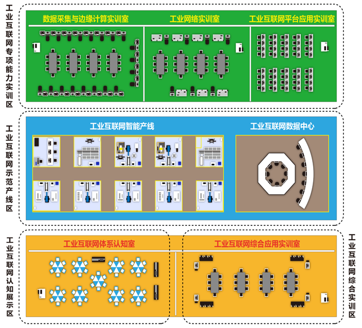 工業(yè)互聯(lián)網(wǎng)綜合實(shí)訓(xùn)區(qū)域:工業(yè)互聯(lián)網(wǎng)綜合實(shí)訓(xùn)區(qū)將實(shí)現(xiàn)典型工業(yè)產(chǎn)線的自動(dòng)化控制、數(shù)據(jù)采集與應(yīng)用、定制化生產(chǎn)、云邊協(xié)同制造等場(chǎng)景,支持工業(yè)互聯(lián)網(wǎng)綜合實(shí)訓(xùn)教學(xué),讓學(xué)生基本具備工業(yè)互聯(lián)網(wǎng)實(shí)施與應(yīng)用的綜合能力。