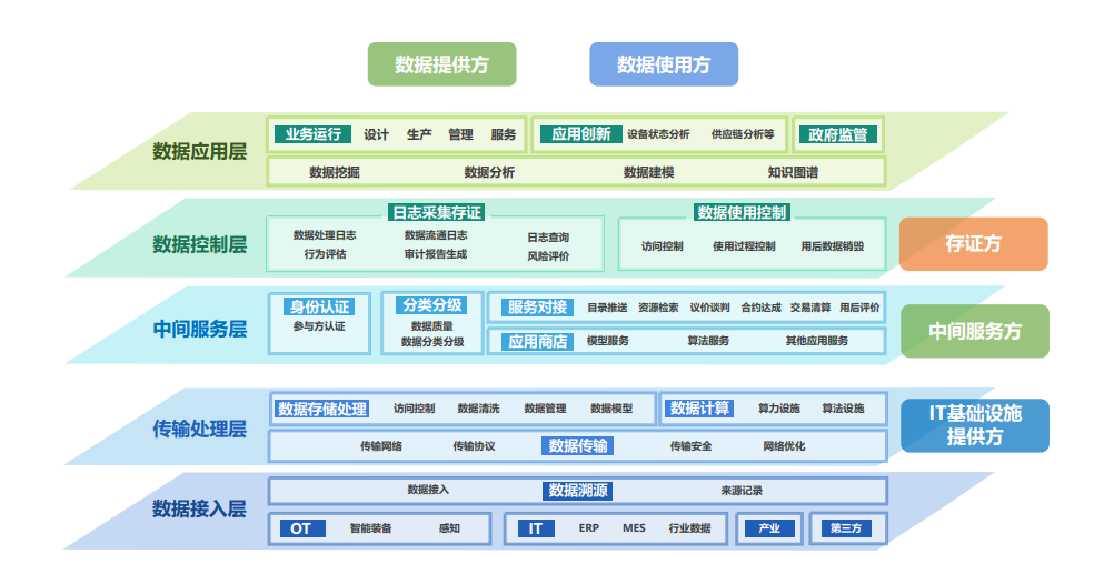 結(jié)合供需矩陣形成可信工業(yè)數(shù)據(jù)空間的功能視圖(如圖2所示),自下而上分別為: 數(shù)據(jù)接入層、傳輸處理層、中間服務(wù)層、數(shù)據(jù)控制層以及數(shù)據(jù)應(yīng)用層。其中藍(lán)色的三層是數(shù)據(jù)共享流通的基礎(chǔ)與載體,黃色的兩層實(shí)現(xiàn)了數(shù)據(jù)共享流通的可信與透明,也是可信工業(yè)數(shù)據(jù)空間的核心部分。