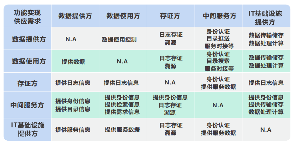 根據(jù)業(yè)務(wù)視圖中各方主體扮演的角色以及之間的供需關(guān)系,可以歸納出一個功能的供需矩陣 (如圖1所示)例如: 縱軸[數(shù)據(jù)提供方]與橫軸[數(shù)據(jù)使用方]對應(yīng)的[數(shù)據(jù)使用控制單元意為數(shù)據(jù)提供方]需要[數(shù)據(jù)使用方]執(zhí)行[數(shù)據(jù)使用控制]。