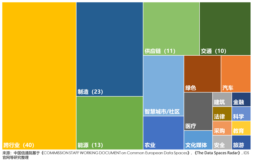 歐盟數據空間建設覆蓋行業領域不斷擴展,其中跨行業、制造、能源、供應鏈、交通的數據空間數量較多。