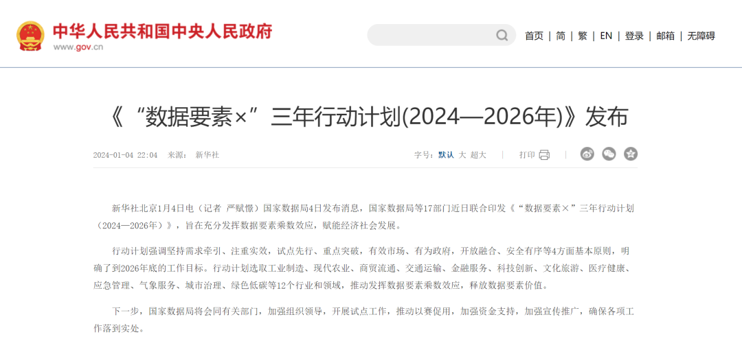 12月31日,國家數據局等17部門聯合印發《“數據要素×”三年行動計劃(2024—2026年)》。該計劃是為深入貫徹落實習近平總書記關于發揮數據要素作用的重要指示精神和黨中央、國務院決策部署,發揮數據要素乘數效應,賦能經濟社會發展,特制訂的行動計劃。