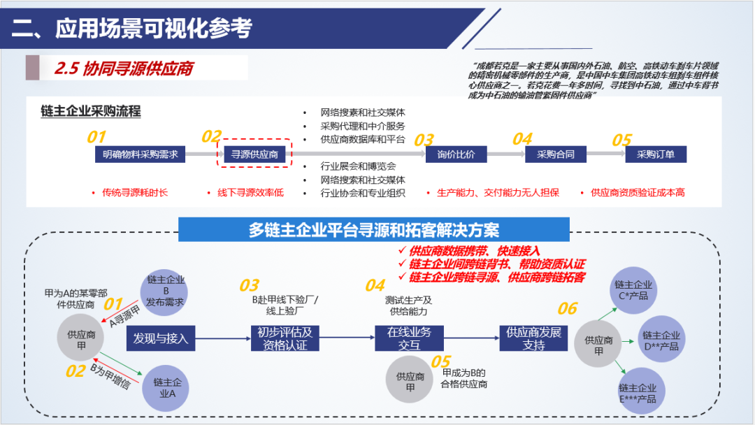 以上針對(duì)供應(yīng)商全生命周期管理的“客戶旅程圖”框架強(qiáng)調(diào)了從尋源到長(zhǎng)期合作的完整客戶旅程,通過(guò)提供高效的在線業(yè)務(wù)交互工具、供應(yīng)商發(fā)展支持、以及跨行業(yè)拓展的增信和背書(shū),鏈主企業(yè)可以吸引并維護(hù)中小企業(yè)供應(yīng)商,同時(shí)提升自己的供應(yīng)鏈競(jìng)爭(zhēng)力和創(chuàng)新能力。