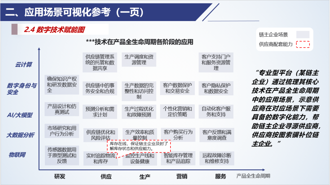 例如,橫軸表示產(chǎn)品生命周期各階段(如研發(fā)、供應(yīng)、生產(chǎn)、銷售、服務(wù)),縱軸表示應(yīng)用的數(shù)字技術(shù)(如物聯(lián)網(wǎng)、大數(shù)據(jù)分析、AI/大模型、數(shù)字身份與安全、云計(jì)算),在坐標(biāo)點(diǎn)處通過(guò)應(yīng)用場(chǎng)景(列表)展示不同技術(shù)在產(chǎn)品生命周期各階段的應(yīng)用。適用于技術(shù)專業(yè)平臺(tái)向制造企業(yè)展示賦能能力,制造企業(yè)從產(chǎn)品全生命周期、企業(yè)資產(chǎn)管理等業(yè)務(wù)維度規(guī)劃統(tǒng)籌數(shù)字化轉(zhuǎn)型,鏈主企業(yè)基于應(yīng)用場(chǎng)景規(guī)劃制定供應(yīng)商的數(shù)字化能力標(biāo)準(zhǔn)。