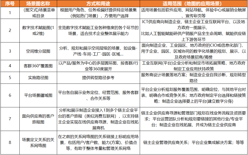 應(yīng)用場(chǎng)景地圖適用于產(chǎn)業(yè)鏈圖譜不能覆蓋的細(xì)分場(chǎng)景,特別是在創(chuàng)新和技術(shù)應(yīng)用方面;尤其適用于平臺(tái)明確定位、實(shí)現(xiàn)差異化競(jìng)爭(zhēng)、以及平臺(tái)間互聯(lián)互通和合作。具體形式包括:技術(shù)賦能制造或供應(yīng)鏈的二維圖、從設(shè)備/產(chǎn)線到全國(guó)布局的空間維分層圖、展示服務(wù)范圍和能力邊界的平臺(tái)場(chǎng)景疆域圖、描繪制造企業(yè)成為鏈主企業(yè)的供應(yīng)商的客戶旅程圖、等等。應(yīng)用場(chǎng)景地圖的特點(diǎn)和優(yōu)點(diǎn)在于可提供全景式展示,可針對(duì)特定客戶群體的需求定制化,可靈活適用于各類應(yīng)用領(lǐng)域,可根據(jù)市場(chǎng)和技術(shù)變化進(jìn)行迭代更新。
