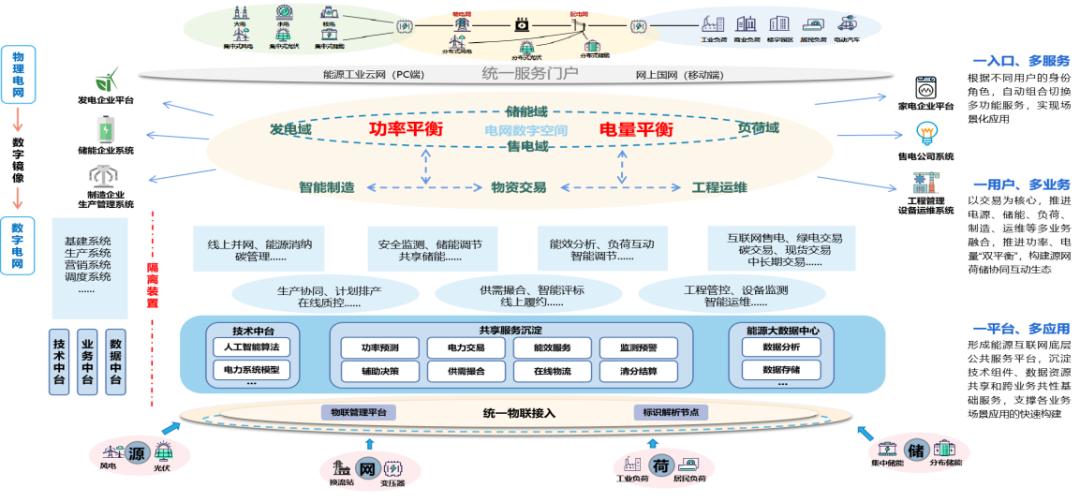 下一層是電力運(yùn)營(yíng)的發(fā)電、儲(chǔ)能、負(fù)荷、售電域四大領(lǐng)域間的協(xié)同工作,確保電力系統(tǒng)的平衡和高效運(yùn)行。并給出電力供應(yīng)鏈支撐場(chǎng)景,通過(guò)智能制造、物資交易、工程運(yùn)維等實(shí)現(xiàn)供應(yīng)鏈的高效管理和優(yōu)化。再給出平臺(tái)支撐的線上業(yè)務(wù)場(chǎng)景,電力能源供應(yīng)鏈和電力運(yùn)營(yíng)的細(xì)化線上場(chǎng)景,通過(guò)技術(shù)和服務(wù)平臺(tái)實(shí)現(xiàn)更高效、靈活和智能的電力管理。最下層是物理實(shí)體世界的數(shù)字化:按源、網(wǎng)、荷、儲(chǔ)電力運(yùn)營(yíng)四大領(lǐng)域數(shù)字化,而不是堆砌設(shè)備。
