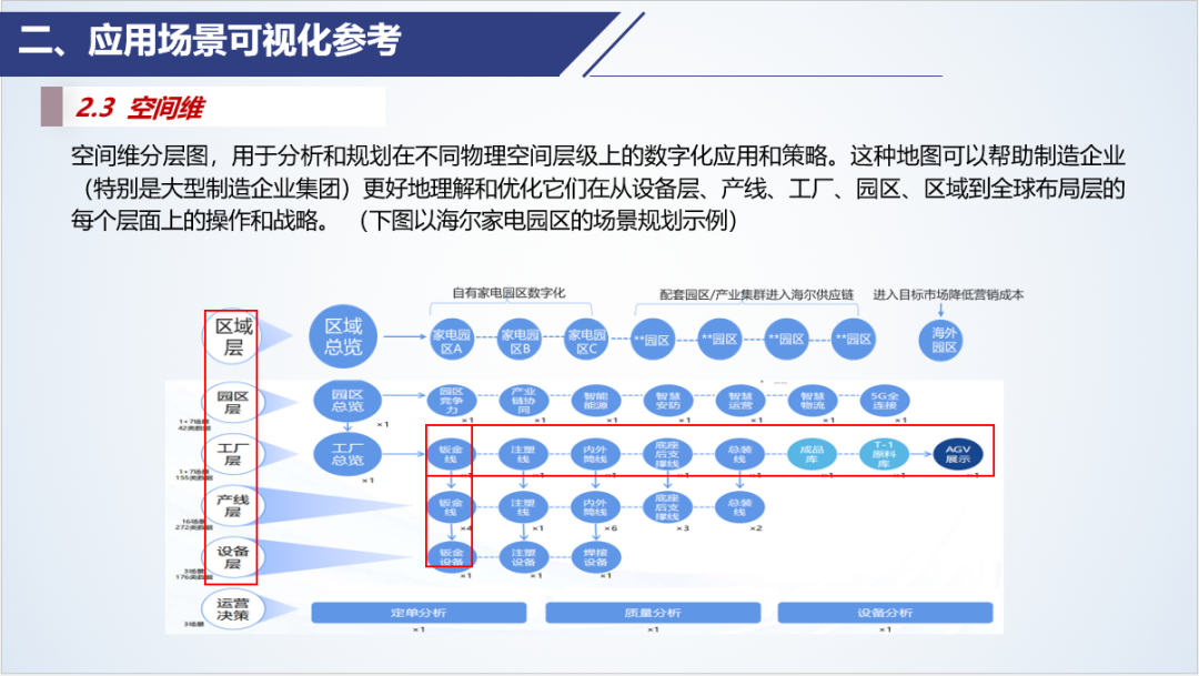 空間維分層圖,即空間維度的應(yīng)用場(chǎng)景地圖,用于分析和規(guī)劃在不同物理空間層級(jí)上的數(shù)字化應(yīng)用和策略。這種地圖可以幫助制造企業(yè)(特別是大型制造企業(yè)集團(tuán))更好地理解和優(yōu)化它們?cè)趶脑O(shè)備層、產(chǎn)線、工廠、園區(qū)、區(qū)域到全球布局層的每個(gè)層面上的操作和戰(zhàn)略。