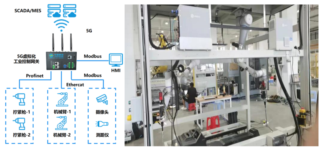 中國(guó)移動(dòng)與國(guó)內(nèi)某新能源廠商合作,在電池組裝產(chǎn)線完成5G+虛擬化PLC技術(shù)驗(yàn)證應(yīng)用。核心方案是采用一臺(tái)安裝虛擬化PLC的5G工業(yè)控制網(wǎng)關(guān),實(shí)現(xiàn)對(duì)“傳統(tǒng)PLC+數(shù)采網(wǎng)關(guān)”的二合一替換。5G工業(yè)控制網(wǎng)關(guān)首先通過(guò)掃描槍、測(cè)距儀完成位置標(biāo)定,控制機(jī)械臂移動(dòng)到電池模組位置。隨后控制機(jī)械臂上的擰緊槍完成電池模組的安裝擰緊。在此案例中,5G工業(yè)控制網(wǎng)關(guān)不僅提供PLC實(shí)時(shí)控制服務(wù),也提供5G數(shù)據(jù)采集、遠(yuǎn)程運(yùn)維服務(wù)。從而將傳統(tǒng)的“現(xiàn)場(chǎng)I/O-PLC-數(shù)采網(wǎng)關(guān)”三層架構(gòu)壓縮成“現(xiàn)場(chǎng)I/O-5G工業(yè)控制網(wǎng)關(guān)”扁平架構(gòu),解決了傳統(tǒng)方案控制層級(jí)多、專用設(shè)備多,成本居高不下,難以實(shí)現(xiàn)無(wú)人化/少人化運(yùn)維等痛點(diǎn)問(wèn)題,設(shè)備硬件成本和運(yùn)維成本均下降50%。