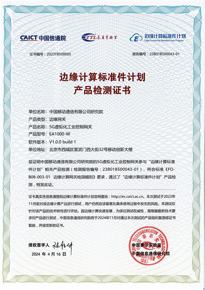 “邊緣計(jì)算標(biāo)準(zhǔn)件計(jì)劃”證書