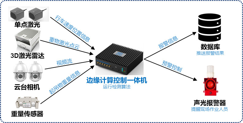 重物起吊是車間中最常見的高風(fēng)險作業(yè)場景,東方研究院基于EC13211研發(fā)了重物起吊作業(yè)安全預(yù)警系統(tǒng),控制器安裝于行車上,就近接入單點激光、3D激光雷達、工業(yè)攝像頭和其他傳感器,進行實時的數(shù)據(jù)采集、姿態(tài)感知和AI視覺處理,具有較高的檢測實時性。系統(tǒng)可在起吊作業(yè)過程中對吊運物下方站人和吊運物前進方向有人等安全風(fēng)險進行智能識別與安全預(yù)警,提醒行車駕駛員及時停止作業(yè),并上傳報警信息。該系統(tǒng)集起吊作業(yè)監(jiān)控、風(fēng)險預(yù)警、違規(guī)報警于一體,極大地降低了重物起吊作業(yè)中的安全風(fēng)險。