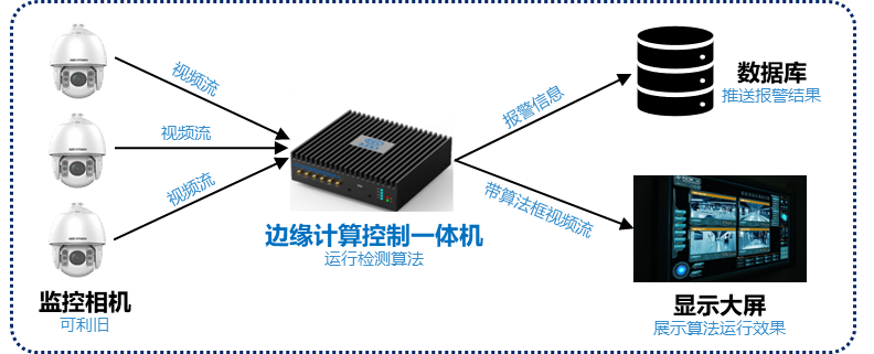 生產(chǎn)車間場景復(fù)雜多變,其中存在一些常見的車間人員不安全行為,如登梯未扶梯、未佩戴安全帽、未正確穿戴工服、作業(yè)場所吸煙以及作業(yè)中看手機等,這些行為極有可能引起重大安全事故。東方研究院針對以上實際生產(chǎn)場景中可能存在的安全風(fēng)險行為,基于EC13211研發(fā)了生產(chǎn)車間不安全行為智能識別系統(tǒng),控制器分布式布置于車間多個位置,就近進行攝像頭的視頻采集和AI處理,支持同時檢測多路視頻流、多種智能算法,高效利用硬件資源,同時降低車間帶寬壓力,實現(xiàn)廣域車間全覆蓋。該系統(tǒng)能夠?qū)崟r發(fā)現(xiàn)、展示并上傳不安全行為報警信息,通過短信提醒指定安全員進行處理,有效降低了車間中可能存在的相關(guān)安全風(fēng)險。