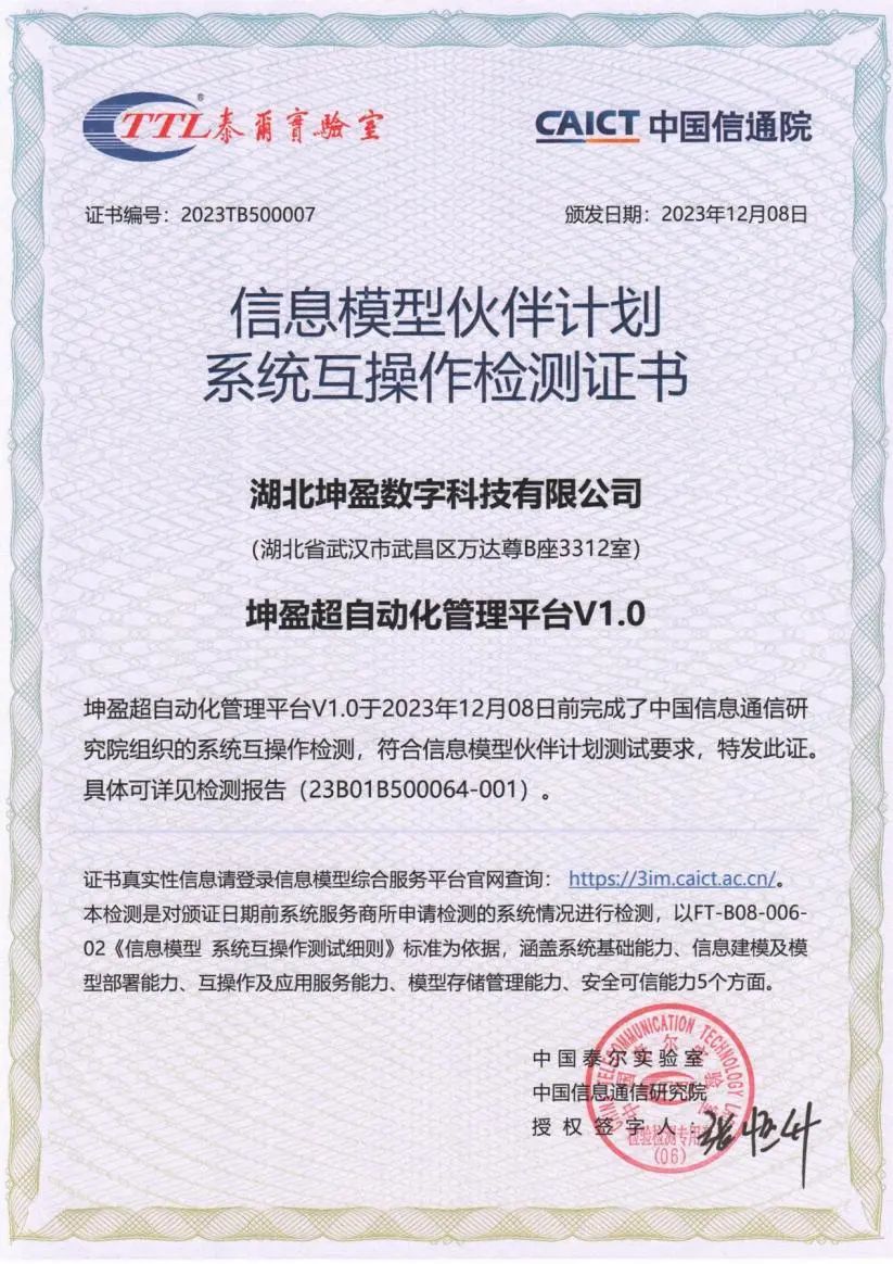 湖北坤盈數(shù)字科技有限公司(以下簡稱“坤盈數(shù)科”)是工業(yè)互聯(lián)網(wǎng)產(chǎn)業(yè)聯(lián)盟信息模型伙伴計劃伙伴單位,自主研發(fā)的坤盈超自動化管理平臺V1.0是基于坤盈數(shù)科企業(yè)數(shù)字化研發(fā)底座衍生出的綜合管理平臺,該平臺完成了中國信息通信研究院組織的系統(tǒng)互操作檢測。