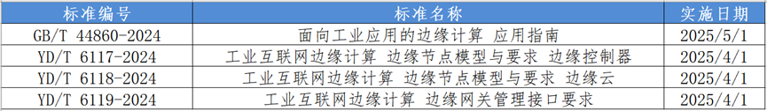 2024年9月20日,工信部印發(fā)《工業(yè)重點(diǎn)行業(yè)領(lǐng)域設(shè)備更新和技術(shù)改造指南》的通知,提出“部署邊緣計(jì)算節(jié)點(diǎn)、邊緣計(jì)算網(wǎng)關(guān)、邊緣控制器、邊緣云等工業(yè)算力設(shè)備”要求,明確“力爭(zhēng)到2027年,80%的規(guī)模以上制造業(yè)企業(yè)基本實(shí)現(xiàn)網(wǎng)絡(luò)化改造,邊緣網(wǎng)關(guān)、邊緣控制器等產(chǎn)品部署超過(guò)100萬(wàn)臺(tái)”目標(biāo)。2024年10月26日,由機(jī)械工業(yè)儀器儀表綜合技術(shù)經(jīng)濟(jì)研究所、中國(guó)信息通信研究院(以下簡(jiǎn)稱“中國(guó)信通院”)、中國(guó)科學(xué)院沈陽(yáng)自動(dòng)化研究所等聯(lián)合牽頭的《面向工業(yè)應(yīng)用的邊緣計(jì)算 應(yīng)用指南》國(guó)家標(biāo)準(zhǔn)正式發(fā)布。2024年12月25日,《工業(yè)互聯(lián)網(wǎng)邊緣計(jì)算 邊緣節(jié)點(diǎn)模型與要求 邊緣控制器》、《工業(yè)互聯(lián)網(wǎng)邊緣計(jì)算 邊緣節(jié)點(diǎn)模型與要求 邊緣云》、《工業(yè)互聯(lián)網(wǎng)邊緣計(jì)算 邊緣網(wǎng)關(guān)管理接口要求》等3項(xiàng)工業(yè)互聯(lián)網(wǎng)邊緣計(jì)算行業(yè)標(biāo)準(zhǔn)正式發(fā)布。
