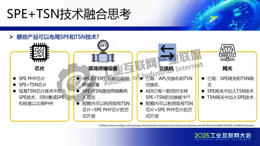 李慶介紹,TSN 提供確定性低時(shí)延通信保障,為各類系統(tǒng)建立統(tǒng)一的工業(yè)骨干網(wǎng)絡(luò)。SPE將以太網(wǎng)覆蓋范圍擴(kuò)展至現(xiàn)場層,實(shí)現(xiàn)設(shè)備全連接,構(gòu)建起真正統(tǒng)一的工業(yè)網(wǎng)絡(luò)。SPE+TSN的融合可降低布線成本、簡化設(shè)備聯(lián)網(wǎng)架構(gòu),為未來各行業(yè)智能化、實(shí)時(shí)化通信提供新的技術(shù)路徑。