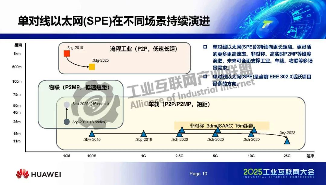 鐘其文介紹,單對線以太網(SPE)在帶寬距離上存在優勢,正逐步替換工業現場的傳統二線制通信技術。單對線以太網(SPE)的持續向更長距離、更靈活的更多更高速率、非對稱、高實時P2MP等維度演進,未來可全面支撐工業、車載、物聯等多場景需求。單對線以太網(SPE)是當前IEEE 802.3活躍項目最多的方向。