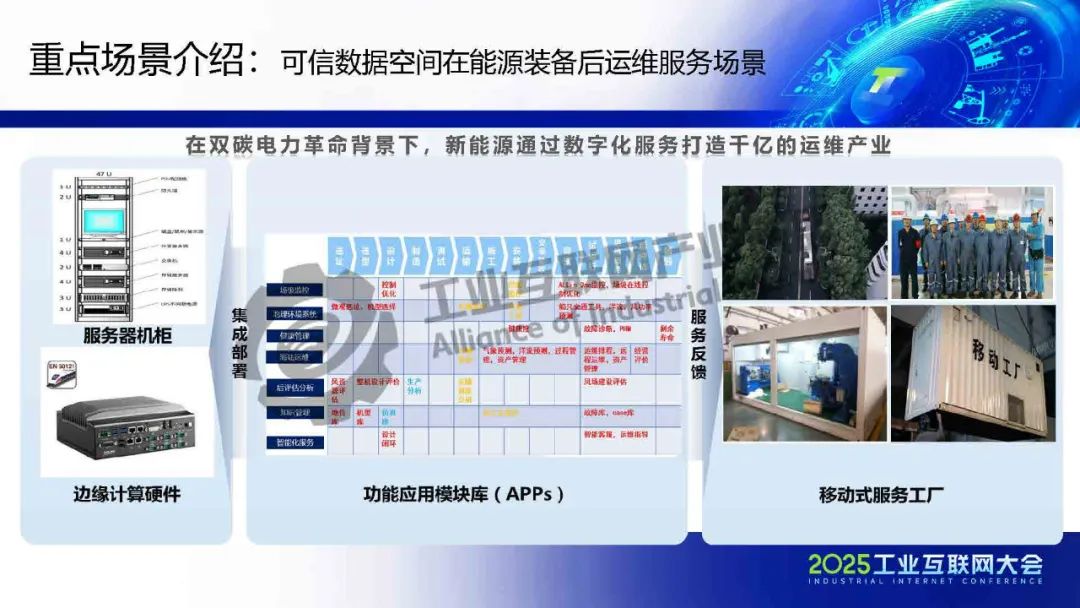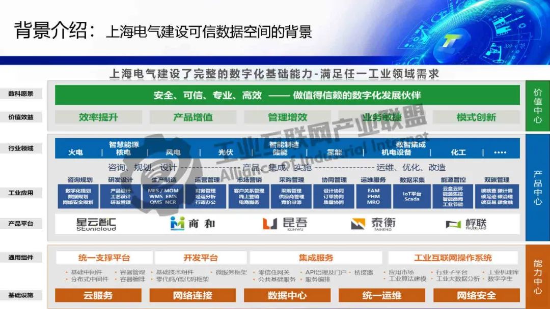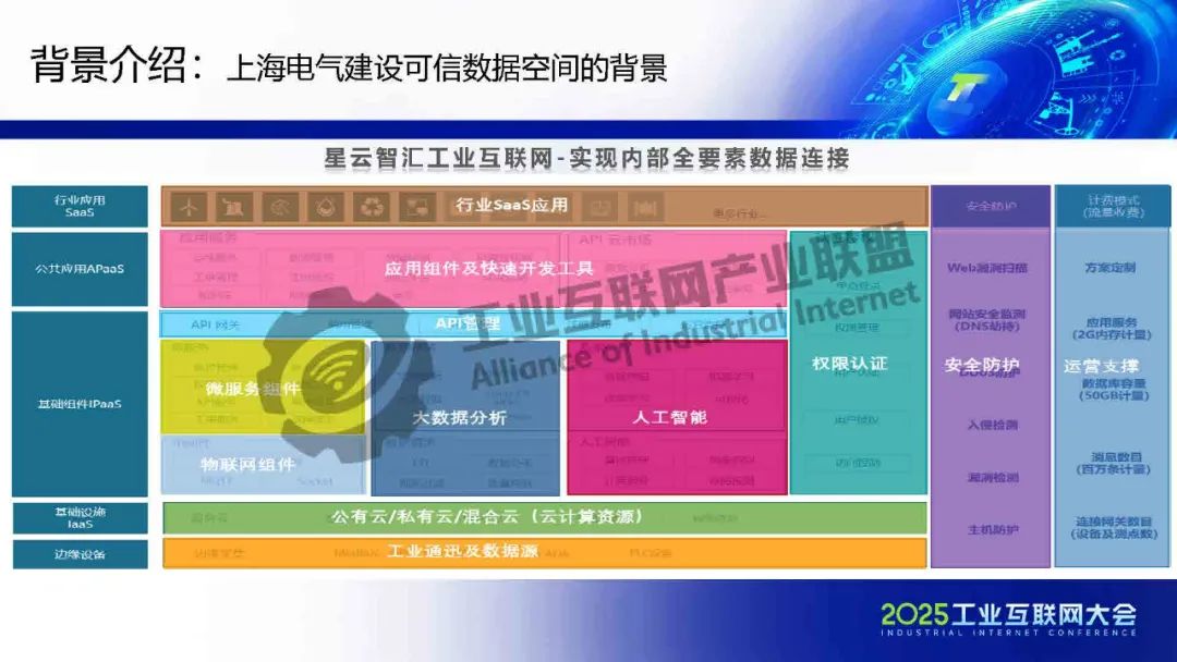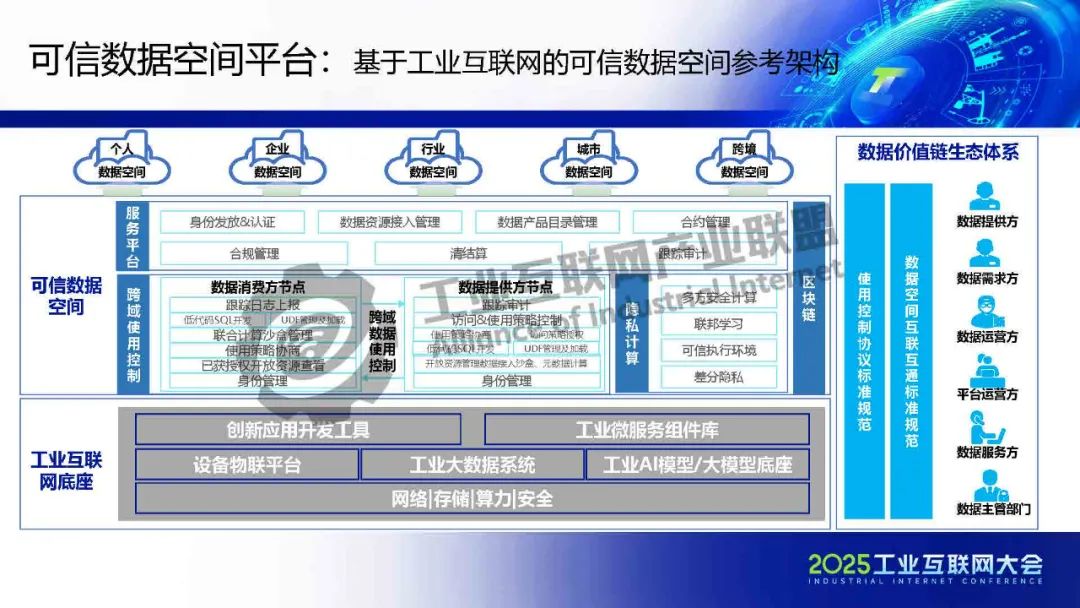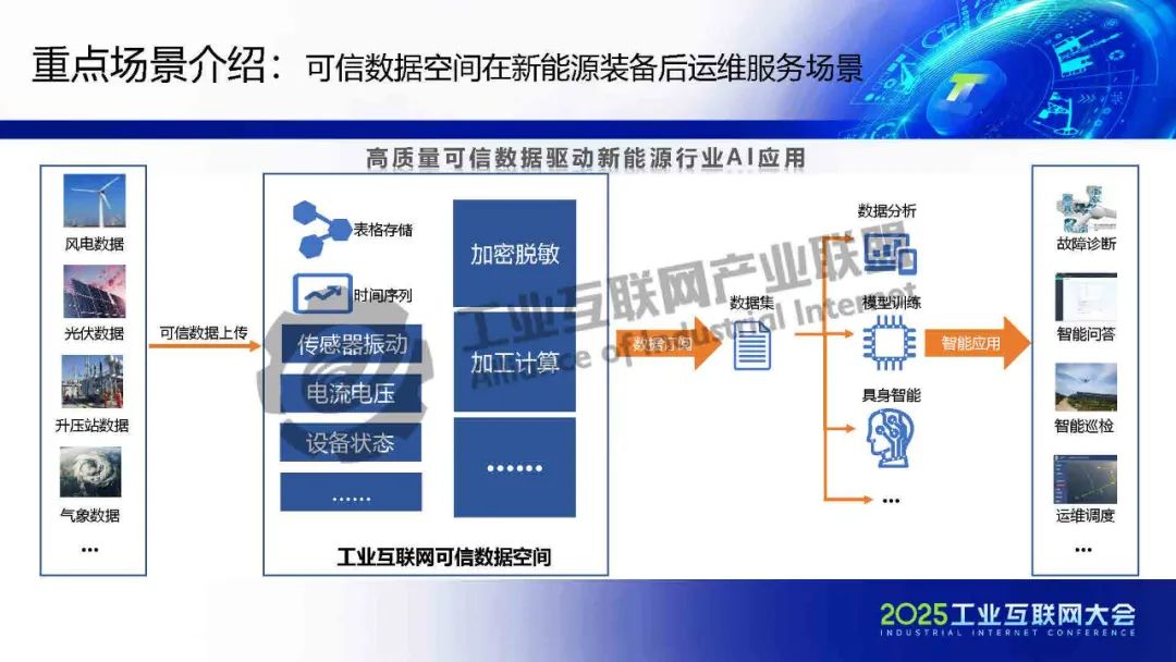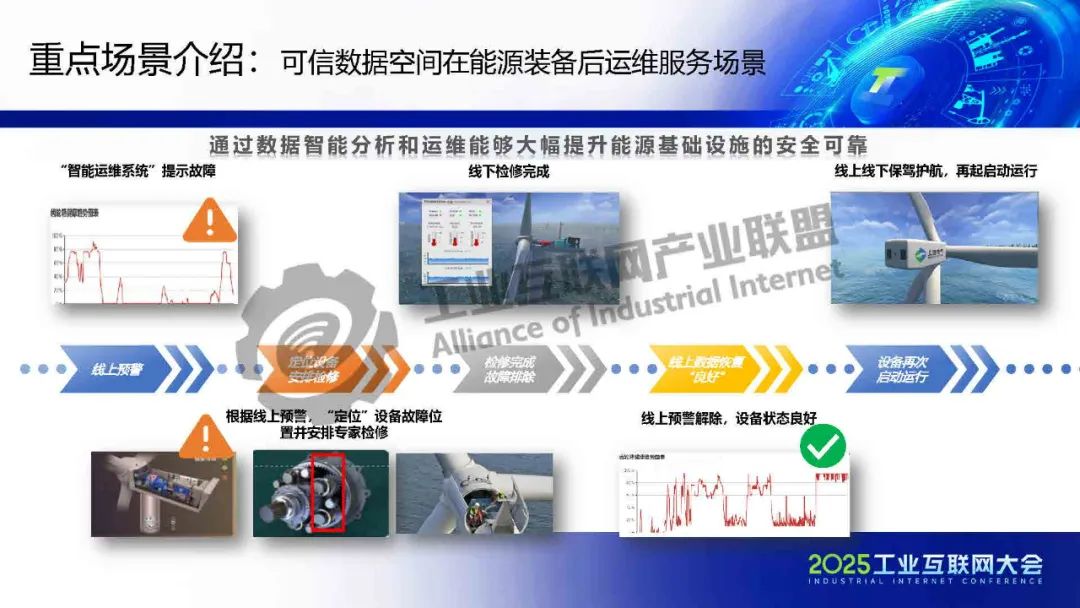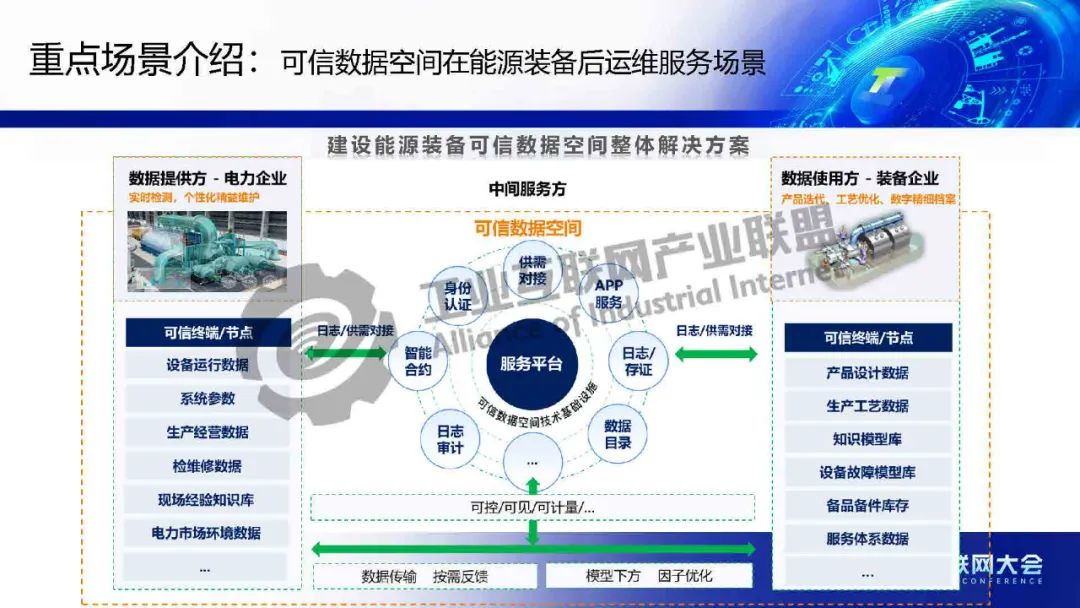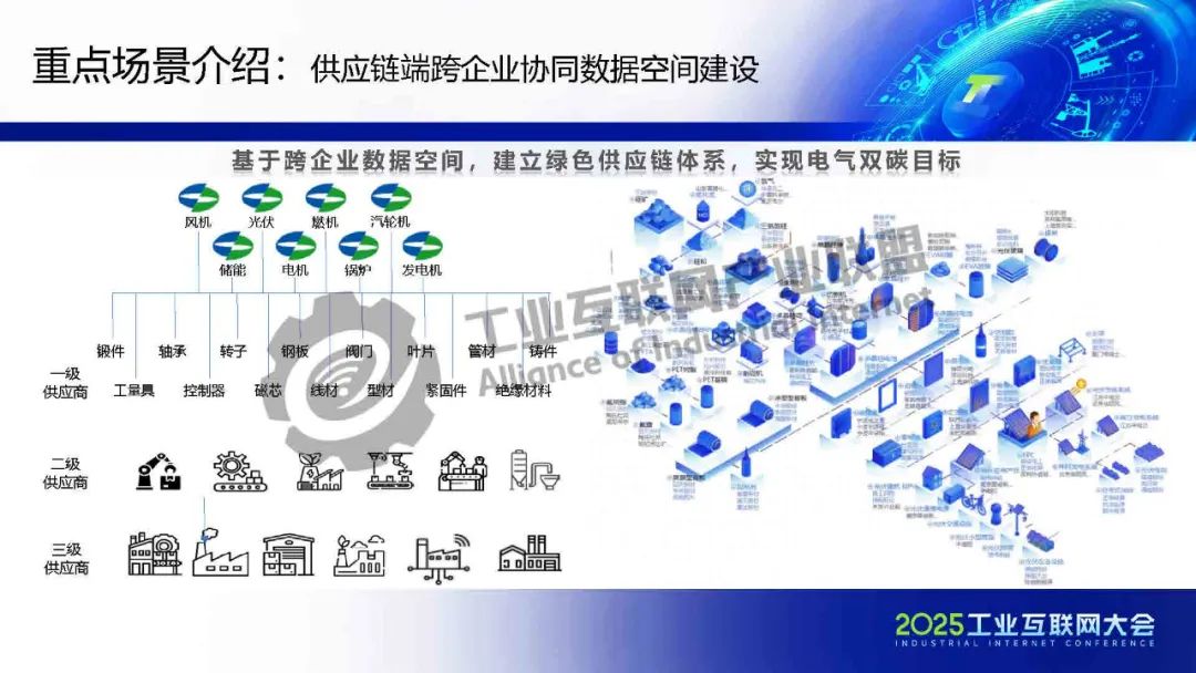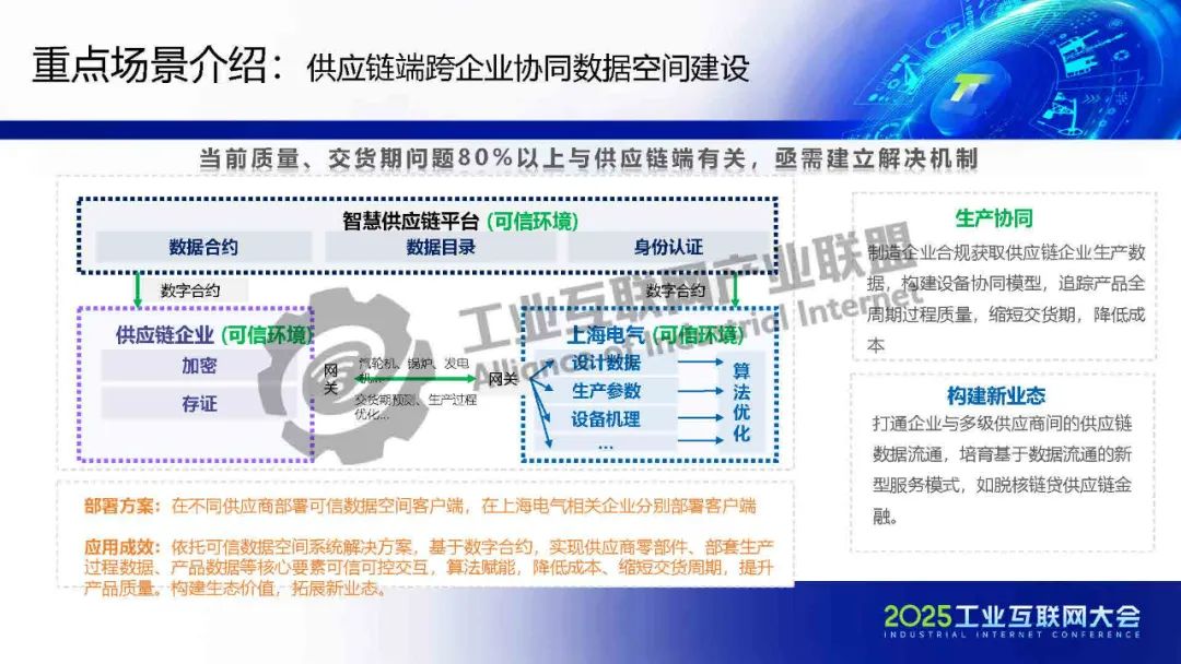 黃猛介紹,可信數(shù)據(jù)空間作為重要的數(shù)據(jù)流通基礎(chǔ)設(shè)施,依托上海電氣在能源和工業(yè)裝備領(lǐng)域的全產(chǎn)業(yè)門類及豐富數(shù)據(jù)場景,構(gòu)建了數(shù)字化基礎(chǔ)能力,包括星云智匯工業(yè)互聯(lián)網(wǎng)和智慧供應(yīng)鏈平臺,實(shí)現(xiàn)了全要素數(shù)據(jù)連接與跨企業(yè)協(xié)同。該平臺基于工業(yè)互聯(lián)網(wǎng)底座,整合區(qū)塊鏈、隱私計算、身份管理等技術(shù),確保數(shù)據(jù)安全與跨域使用控制。重點(diǎn)應(yīng)用場景包括能源裝備后運(yùn)維服務(wù),通過數(shù)據(jù)智能分析提升安全可靠性,并驅(qū)動新能源行業(yè)AI應(yīng)用;以及供應(yīng)鏈端跨企業(yè)協(xié)同,通過可信數(shù)據(jù)空間解決質(zhì)量與交貨期問題,實(shí)現(xiàn)金融普惠、綠色供應(yīng)鏈和雙碳目標(biāo)。