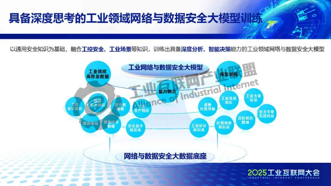 孫浩介紹,盡管DeepSeek等通用大模型迅速崛起并持續突破,但在工業網絡與數據安全等垂直領域應用時,仍面臨專業場景適配性不足等挑戰。工業網絡與安全應用通過對大模型進行針對性訓練,推動其能力與工業網絡及數據安全場景深度融合,確保大模型在工業互聯網安全領域的可靠落地,以通用安全知識為基礎,融合工控安全、工業場景等知識,訓練出具備深度分析、智能決策能力的工業領域網絡與數據安全大模型。