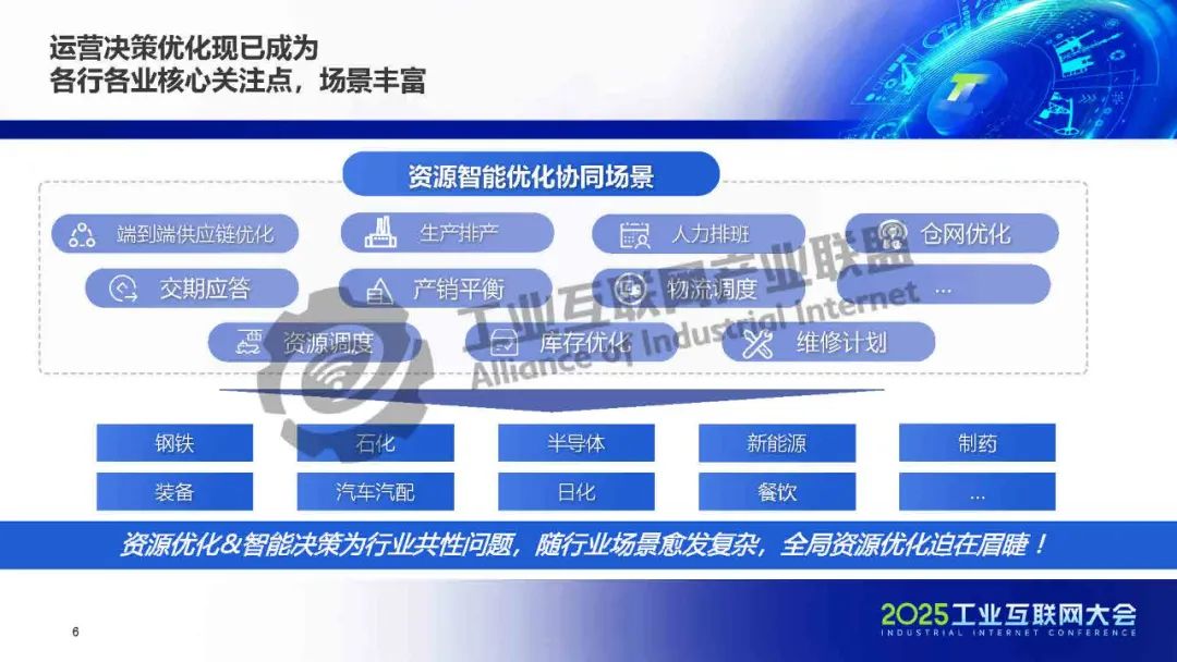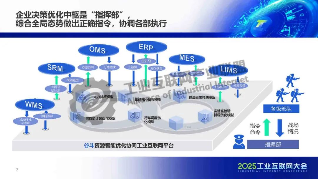 企業(yè)決策優(yōu)化中樞可比作"指揮部",通過其資源智能優(yōu)化協(xié)同工業(yè)互聯(lián)網(wǎng)平臺(tái)整合ERP、SRM、WMS等各業(yè)務(wù)系統(tǒng)數(shù)據(jù),形成全局態(tài)勢(shì)感知。該平臺(tái)包含成品需求預(yù)測(cè)、供應(yīng)鏈計(jì)劃優(yōu)化、車間作業(yè)指揮等專業(yè)模型,像指揮部一樣綜合分析生產(chǎn)任務(wù)、設(shè)備流程、實(shí)驗(yàn)室檢驗(yàn)等"戰(zhàn)場(chǎng)情況",生成最優(yōu)指令并協(xié)調(diào)各部門執(zhí)行。這種"指揮-部隊(duì)"協(xié)同模式實(shí)現(xiàn)了從主計(jì)劃到具體作業(yè)的全鏈路智能決策,有效提升了企業(yè)在復(fù)雜業(yè)務(wù)環(huán)境下的資源優(yōu)化和協(xié)同效率。