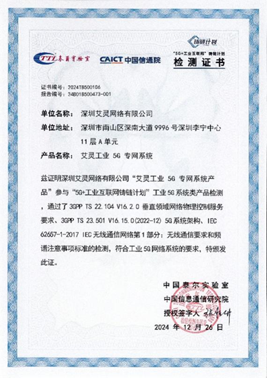 近日,深圳艾靈網(wǎng)絡(luò)有限公司的AI5GS產(chǎn)品順利通過第一批“5G+工業(yè)互聯(lián)網(wǎng)”鑄鏈計(jì)劃產(chǎn)品測試,測試內(nèi)容涵蓋Ethernet會話、5G LAN、業(yè)務(wù)傳輸時(shí)延、可靠性、工業(yè)網(wǎng)絡(luò)業(yè)務(wù)能力多個(gè)方面。