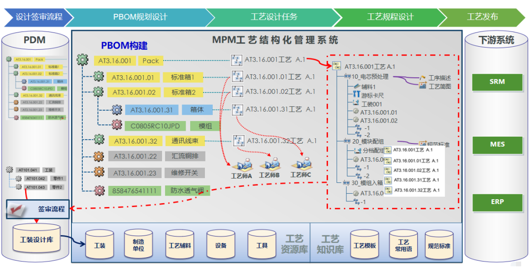 工具軟件應(yīng)用方面:依托結(jié)構(gòu)化工藝平臺,向上對接研發(fā)數(shù)據(jù)管理的PLM以及建模及仿真軟件,向下對接MES、ERP等系統(tǒng),打通研發(fā)-工藝-制造的全數(shù)字化流程。