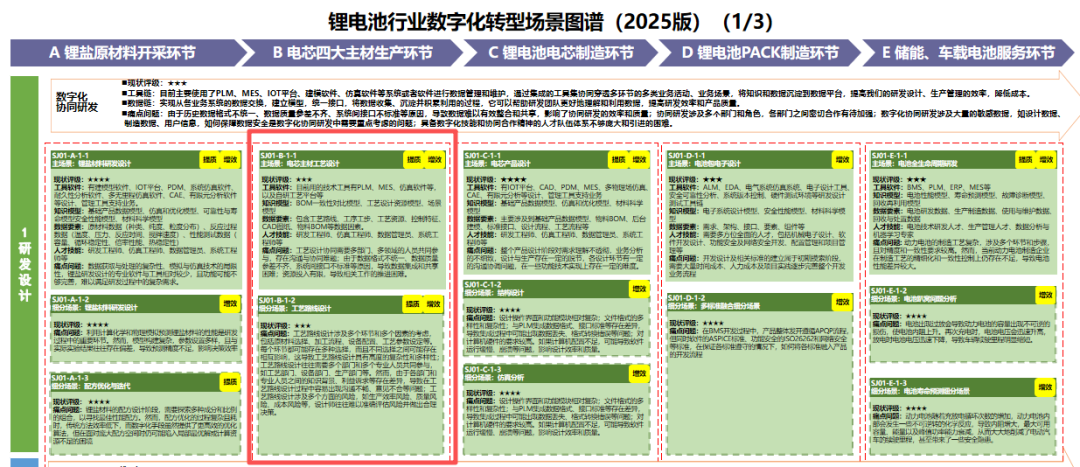 工業(yè)和信息化部9月16日印發(fā)《場景化、圖譜化推進(jìn)重點(diǎn)行業(yè)數(shù)字化轉(zhuǎn)型的參考指引(2025版)》,其附件中給出14個(gè)行業(yè)場景圖譜(2025版),為各行業(yè)數(shù)字化轉(zhuǎn)型應(yīng)用實(shí)踐提供了方法指引。鋰電池行業(yè)數(shù)字化轉(zhuǎn)型場景圖譜涉及研發(fā)設(shè)計(jì)、生產(chǎn)制造、運(yùn)維服務(wù)、經(jīng)營管理、供應(yīng)鏈管理等5個(gè)關(guān)鍵環(huán)節(jié)、73個(gè)典型場景。現(xiàn)對鋰電池行業(yè)的典型場景進(jìn)行解讀。