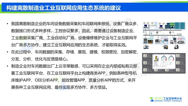 “談到工業(yè)互聯(lián)網(wǎng)應(yīng)用,非常重要的一點是生態(tài)系統(tǒng)的構(gòu)建,尤其是針對離散制造業(yè)。在這里也提出一個倡議,我國離散制造業(yè)的車間設(shè)備數(shù)據(jù)采集率和聯(lián)網(wǎng)率很低,設(shè)備廠商眾多,設(shè)備接口形式眾多,工控協(xié)議眾多,因此我們需要通過設(shè)備制造企業(yè)、工業(yè)數(shù)據(jù)采集廠商、工業(yè)自動化廠商、設(shè)備維修企業(yè)和工業(yè)互聯(lián)網(wǎng)平臺廠商多方協(xié)作,來建立工業(yè)互聯(lián)網(wǎng)應(yīng)用的生態(tài)系統(tǒng),才能取得實效。”