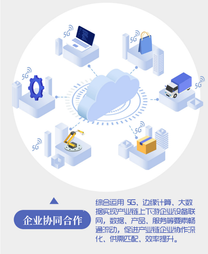 利用5G+數采技術,縱向實現上下游企業大規模關鍵設備聯網和數據實時采集;通過5G+邊緣計算,橫向實現制造執行系統(MES)、供應商關系管理系統(SRM)等互聯互通,并統一集成至云平臺實現數據共享。企業可實時追蹤內部生產過程和進度,對委托外部生產的工序進行監控并實時跟蹤協同流程,快速滿足用戶的個性化定制需求和多品類生產需求。通過平臺連接供給側和需求側,實現供需對接與交易撮合。