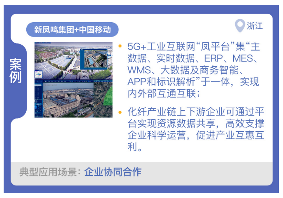 新鳳鳴集團股份有限公司與中國移動合作,搭建化纖產業5G+工業互聯網平臺“鳳平臺”,實現了企業協同合作場景的應用。平臺集“主數據、實時數據、企業資源計劃(ERP)、MES、WMS、大數據及商務智能、應用程序(APP)和標識解析”于一體,實現內外部互通互聯。通過鳳平臺整合從市場、銷售到生產物流全環節等資源,構建靈活組織能力,實現產品配送、自提一體化管理,采、產、銷一體化分析和內外貿物流一體化運營,實時掌握化纖生產訂單及質量數據。利用5G技術和5G工業模組、工業網關、工業PLC等5G終端,貫穿化纖產業上下游,對生產環節關鍵設備實現實時監控?;w產業鏈上下游企業可通過平臺實現資源數據共享,高效支撐企業科學運營,促進產業互惠互利。