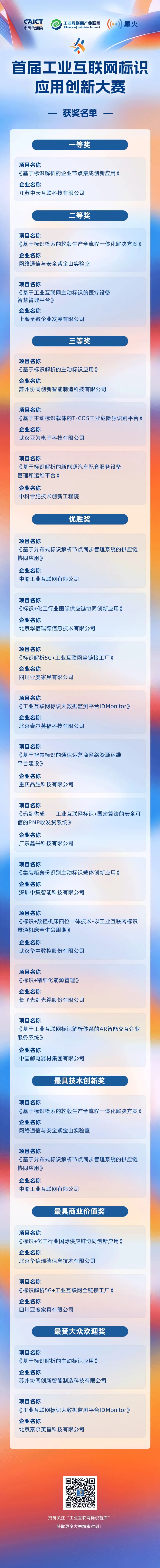 2023年12月13日,首屆工業(yè)互聯(lián)網(wǎng)標識應用創(chuàng)新大賽總決賽落下帷幕;14日,工業(yè)互聯(lián)網(wǎng)標識貫通創(chuàng)新發(fā)展大會暨首屆工業(yè)互聯(lián)網(wǎng)標識應用創(chuàng)新大賽總決賽頒獎儀式在重慶市舉辦。首屆工業(yè)互聯(lián)網(wǎng)標識應用創(chuàng)新大賽正式圓滿收官。