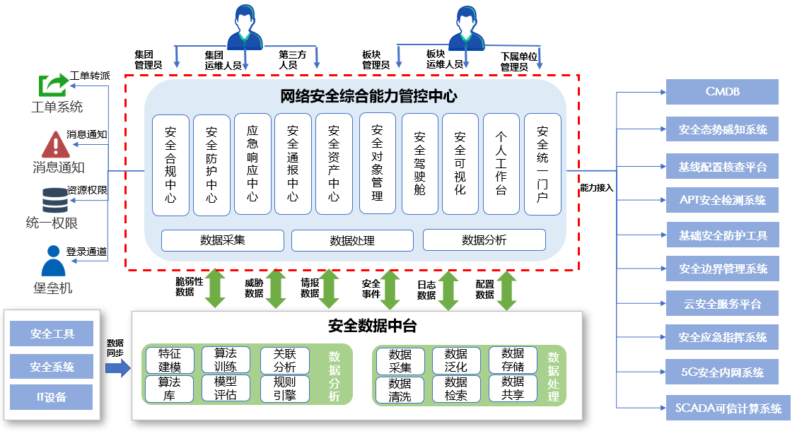 安全綜合能力管控平臺采用集團(tuán)集中部署,用戶分權(quán)分域模式建設(shè),支持微服務(wù)架構(gòu),通過集團(tuán)側(cè)安全工具的集中納管、安全能力的分類調(diào)用,以IPDRR模型為指引構(gòu)建安全能力中心,為浙能集團(tuán)及下屬單位安全運(yùn)營人員提供安全服務(wù)。建設(shè)安全合規(guī)中心、安全監(jiān)測中心、安全防護(hù)中心、應(yīng)急響應(yīng)中心,依托浙能集團(tuán)數(shù)據(jù)中臺安全數(shù)據(jù)實(shí)現(xiàn)安全駕駛艙,在滿足安全監(jiān)管要求的同時(shí),具備網(wǎng)絡(luò)安全中臺演進(jìn)能力,為浙能集團(tuán)安全建設(shè)降本增效,解決浙能集團(tuán)安全設(shè)備管理建設(shè),安全運(yùn)營缺乏協(xié)同等問題。