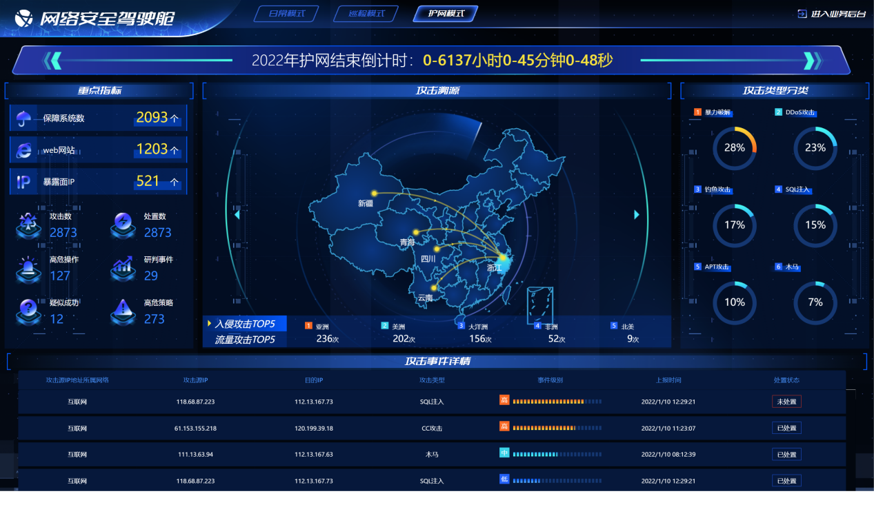 重保/護(hù)網(wǎng):在提供重保模式安全駕駛艙,可針對重保護(hù)網(wǎng)期間產(chǎn)生的安全事件進(jìn)行動(dòng)態(tài)呈現(xiàn),展示安全風(fēng)險(xiǎn)變化情況;提供應(yīng)急處置入口,針對護(hù)網(wǎng)期間需要進(jìn)行封堵的大批量IP地址進(jìn)行極速封堵操作,快速完成攻擊阻斷。