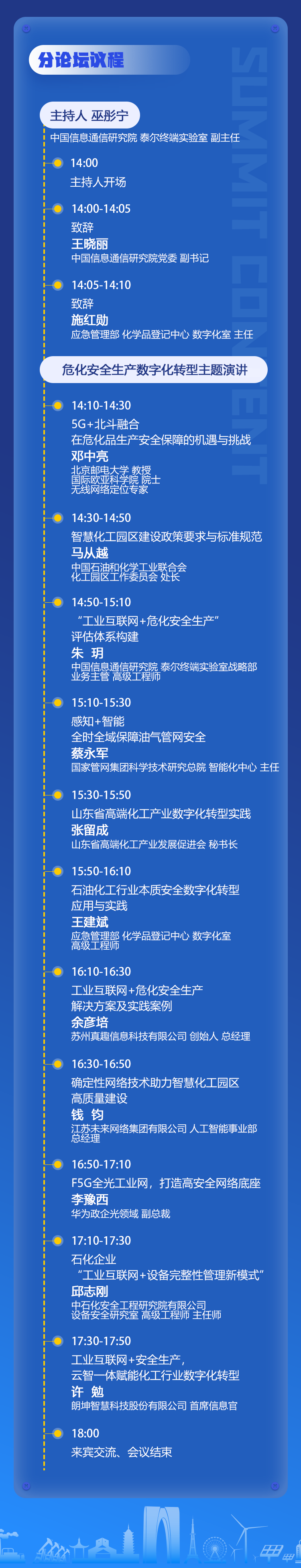 為認真貫徹落實中共中央辦公廳、國務院辦公廳《關于全面加強危險化學品安全生產(chǎn)工作的意見》,加快推進危險化學品安全生產(chǎn)信息化、智能化建設與應用工作,根據(jù)工業(yè)和信息化部、應急管理部《“工業(yè)互聯(lián)網(wǎng)+安全生產(chǎn)”行動計劃(2021-2023年)》和應急管理部《“工業(yè)互聯(lián)網(wǎng)+危化安全生產(chǎn)”試點建設方案》,結合廣大危險化學品生產(chǎn)企業(yè)的實際需求,推動危險化學品企業(yè)實現(xiàn)數(shù)字化轉型、智能化升級,提高我國在危險化學品安全治理能力,擬于2023年工業(yè)互聯(lián)網(wǎng)大會期間,6月15日在蘇州太湖國際會議中心舉辦“工業(yè)互聯(lián)網(wǎng)+危化安全生產(chǎn)數(shù)字化轉型論壇”,論壇旨在通過政策研讀、行業(yè)前瞻、成果展示、創(chuàng)新案例發(fā)布等形式,展示我國危險化學品生產(chǎn)領域安全應急產(chǎn)業(yè)的現(xiàn)狀以及發(fā)展成就,同時聚焦危化品生產(chǎn)領域核心技術及前沿應用,發(fā)布行業(yè)創(chuàng)新成果,交流經(jīng)驗展望未來,助力科技成果產(chǎn)業(yè)化,加強政產(chǎn)學研用深度融合,推動危化品產(chǎn)業(yè)高質量發(fā)展。 活動主題:危化安全生產(chǎn)任重道遠,數(shù)字轉型升級大勢所趨承辦單位:中國信息通信研究院泰爾終端實驗室、山東省高端化工產(chǎn)業(yè)發(fā)展促進會時間地點:2023年6月15日14:00-18:00(和合廳CD)