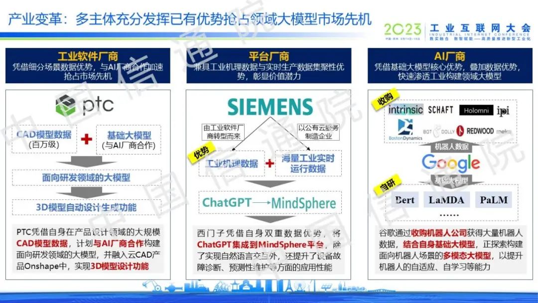 在領(lǐng)域大模型生態(tài)中,工業(yè)軟件廠商憑借細(xì)分場景數(shù)據(jù)優(yōu)勢,通過與AI廠商合作加速搶占市場先機(jī);平臺企業(yè)具備工業(yè)機(jī)理與實時生產(chǎn)數(shù)據(jù)雙重優(yōu)勢,將彰顯巨大價值潛能;同時,AI廠商已具備基礎(chǔ)大模型技術(shù)優(yōu)勢,再疊加數(shù)據(jù)優(yōu)勢,能夠快速滲透工業(yè)構(gòu)建領(lǐng)域大模型。