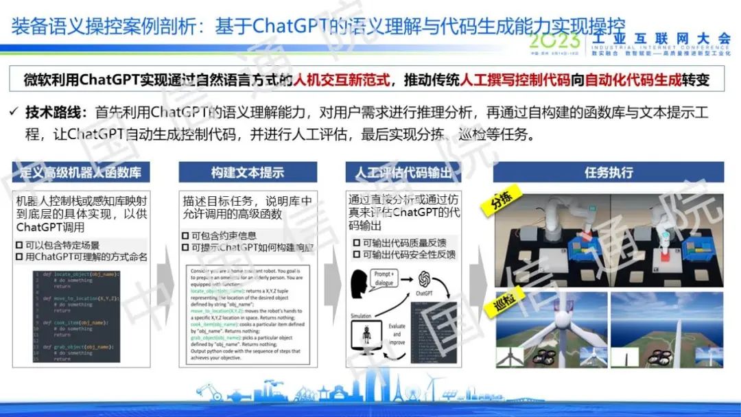 在裝備語義操控場景中,能夠利用ChatGPT的語義理解能力進(jìn)行機(jī)器人智能操控,其實現(xiàn)邏輯是定義高級機(jī)器人函數(shù)庫,再構(gòu)建文本提示,然后通過人工評估代碼輸出質(zhì)量,滿足質(zhì)量要求后機(jī)器人即可執(zhí)行分揀和巡檢等任務(wù),這意味著人機(jī)交互范式正在加速創(chuàng)新。