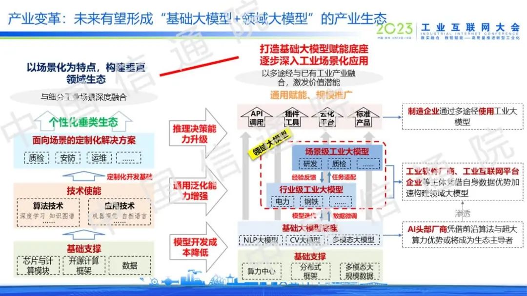 在2019年之前,工業(yè)智能還處于專用智能階段。隨著大模型技術(shù)的躍遷式發(fā)展,工業(yè)智能演變出了以工業(yè)大模型和專用小模型為主的兩條路線。工業(yè)大模型將加速與領(lǐng)域適配,提升多任務(wù)的執(zhí)行能力,專用小模型將與強(qiáng)工業(yè)機(jī)理環(huán)節(jié)融合的更加深入。