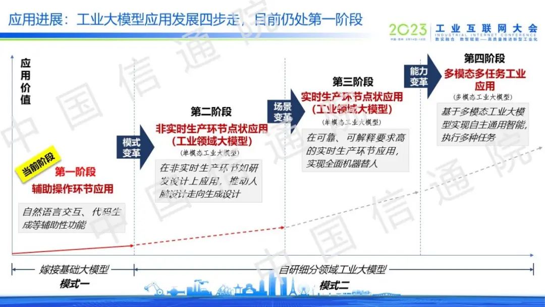 工業(yè)大模型未來應(yīng)用發(fā)展分為兩大模式、四個階段。第一階段是以直接嫁接大模型為主要模式實現(xiàn)輔助操作環(huán)節(jié)應(yīng)用。第二、三、四階段是以自研細(xì)分領(lǐng)域工業(yè)大模型為主要模式,并不斷向工業(yè)實時核心環(huán)節(jié)演進(jìn),同時提升多任務(wù)執(zhí)行能力。