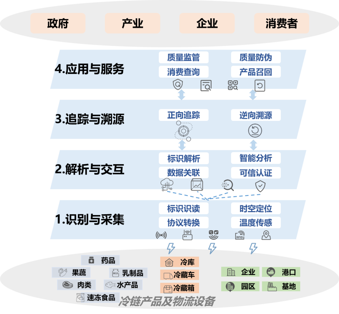 依托工業互聯網標識解析基礎設施,以標識解析、數據模型、主動標識載體、實時定位、區塊鏈等五大關鍵技術為支撐,提出了包含識別與采集、解析與交互、追蹤與溯源、應用與服務等在內的四層追溯架構。通過對冷鏈物流產品、設備及設施等對象進行唯一標識,利用主動標識載體、時空定位等具備實時通信能力的采集設備進行關鍵環節溫控數據的可信獲取,借助標識解析的關聯交互能力實現標識對象的正向可追蹤和逆向可溯源,從而達到冷鏈物流全鏈條追溯的目標。