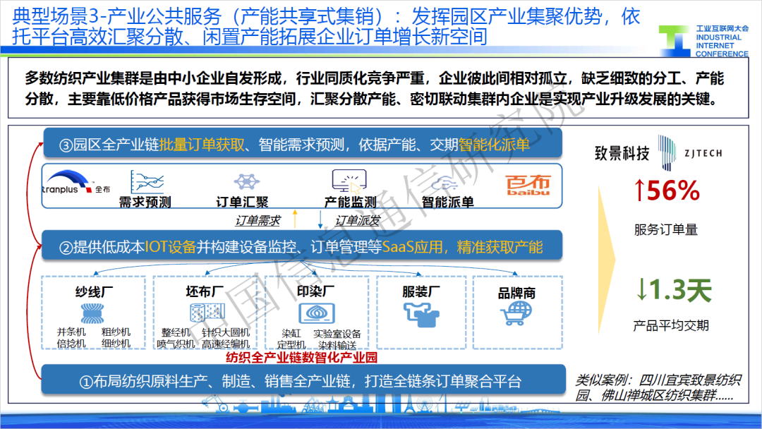 三是產能共享式集銷,紡織企業同質化競爭嚴重,缺乏細致的分工、產能分散,主要靠低價格產品獲得市場生存空間。某服務商針對紡織企業痛點打造集采集銷平臺,將訂單需求與企業生產拉通,通過智能化派單優化提高資源配置效率,應用過程中有效提升企業訂單數量56%。
