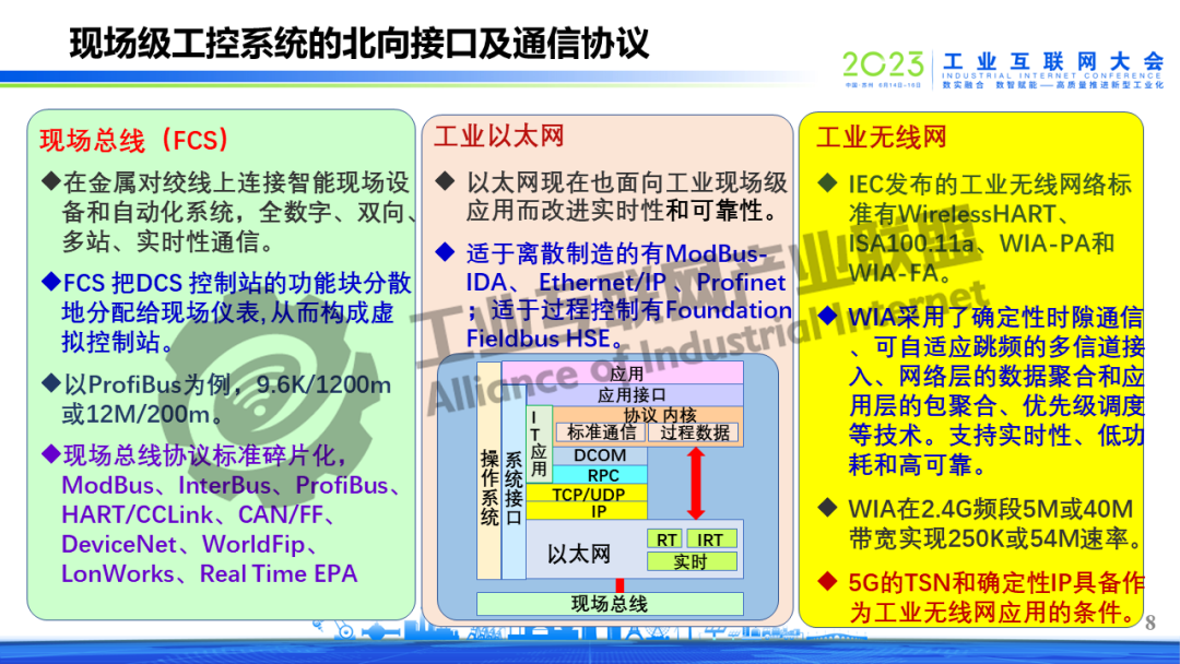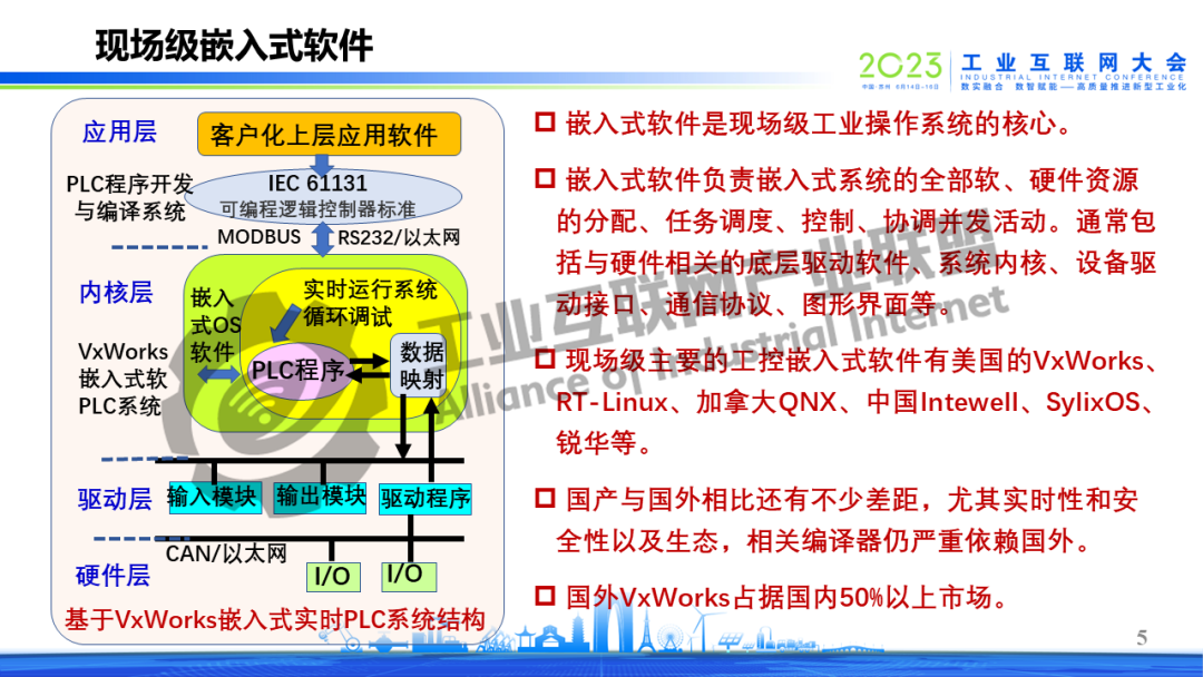 6月16日上午,在2023工業互聯網大會開幕式上,中國工程院院士鄔賀銓《夯實工業互聯網的底座》為題作演講,指出工業互聯網個性化主要表現在現場級,重點與難點在現場級工控系統。政府引導垂直行業龍頭牽頭開發現場級工控系統的統一標準,當前可從各類現場級工控系統標準的最大公約數入手開發并推薦兼容標準,明確新增市場采用統一標準。抓工業CPU開發,以5G工業模組為抓手,推動軟硬結合、IT/OT的融合,建立新型現場級工控系統生態。